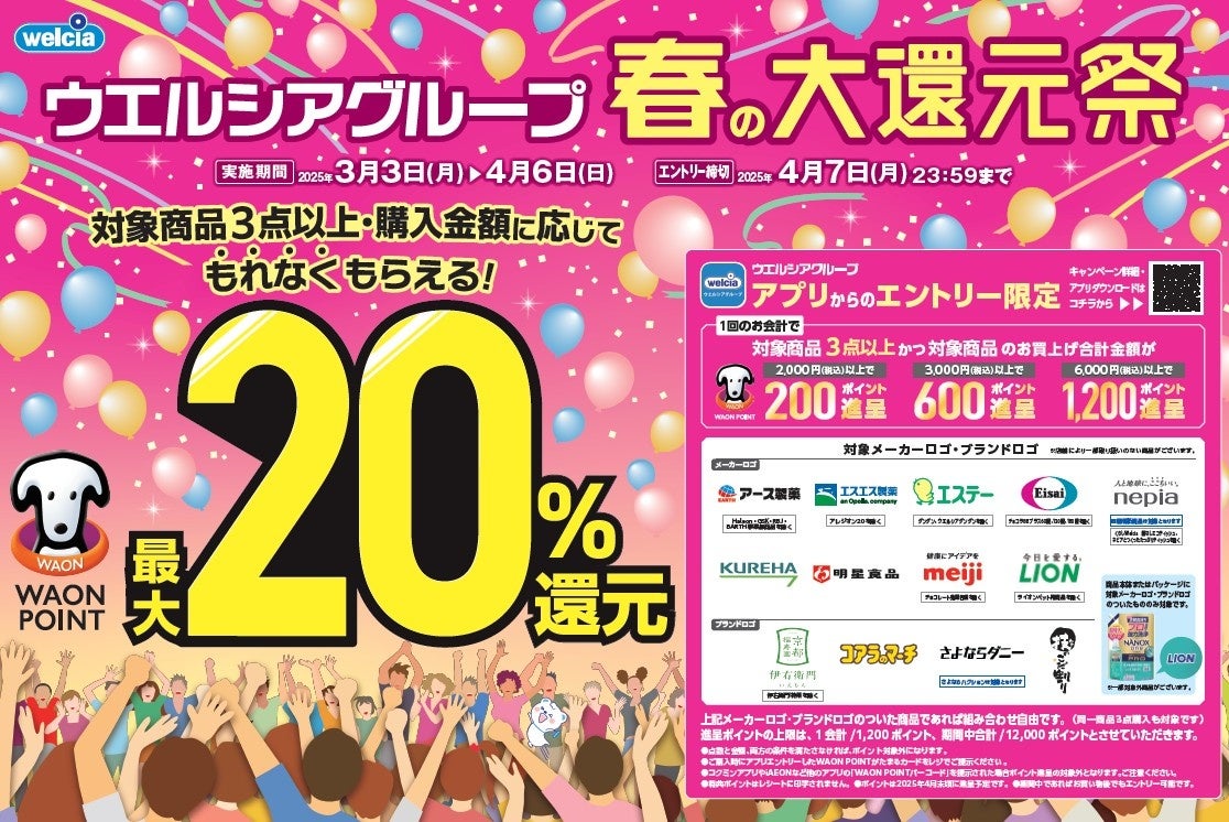ウエルシア薬局株式会社(本社:東京都千代田区、代表取締役社長:田中純一、以下 ウエルシア薬局)は、2025年3月3日(月)よりウエルシアグループの店舗でお買い物をされたお客様を対象に最大でWAON POINTが最大20%還元される「ウエルシアグループ春の大還元祭」を期間限定で開催することをお知らせします。