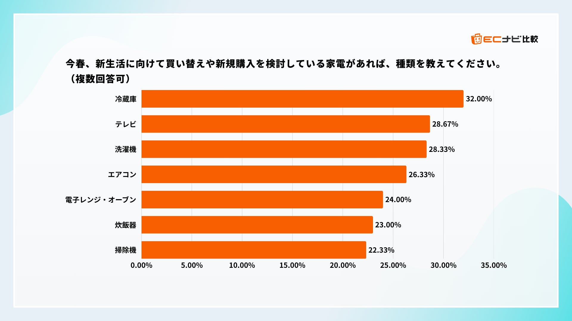 新生活に向けて買い替えや新規購入を検討している家電について聞いたところ、「冷蔵庫」(32.00%)が最も多く、次いで「テレビ」(28.67%)、「洗濯機」(28.33%)、エアコン(26.33%)という結果になりました。大型家電が上位を占めており、これらの主要な生活必需品が新生活準備の中心となっていることがわかります。また、中小型家電(電子レンジ・オーブン、炊飯器、掃除機)もそれぞれ2割強で、比較的需要があることが示されています。