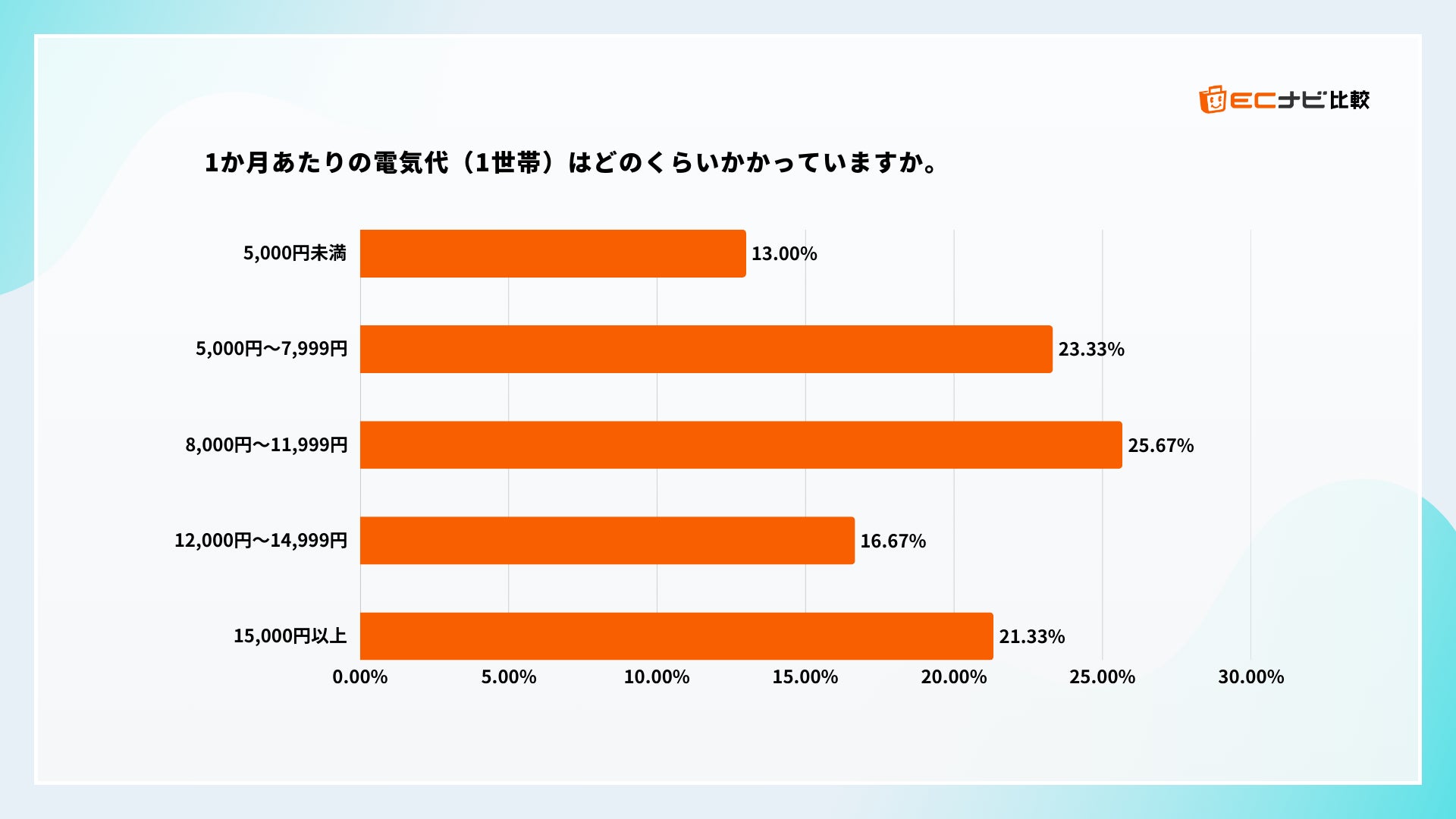 1か月あたりの電気代について聞いたところ、「8,000円~11,999円」が25.67%と最も多く、次いで「5,000円~7,999円」が23.33%となっています。「15,000円以上」も21.33%と高い割合を示しており、全体の約65%の世帯が月8,000円以上の電気代を支払っていることがわかります。