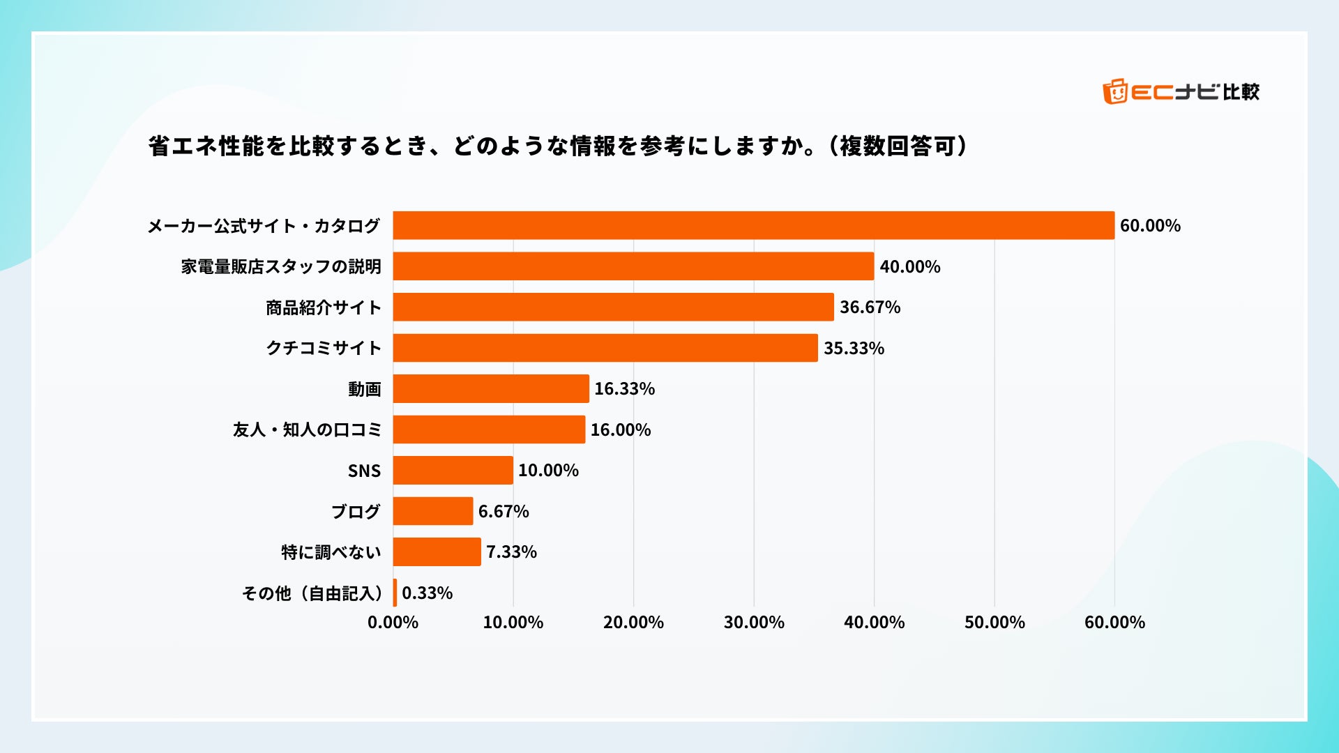 家電の省エネ性能を比較するとき、どのような情報を参考にしているか聞いたところ、「メーカー公式サイト・カタログ」が60.00%と最も多く、次いで「家電量販店スタッフの説明」(40.00%)、「商品紹介サイト」(36.67%)、「クチコミサイト」(35.33%)が続いています。公式情報と専門家の意見が重視される傾向があり、SNS(10.00%)やブログ(6.67%)などのソーシャルメディアからの情報は相対的に参照されていないことがわかります。