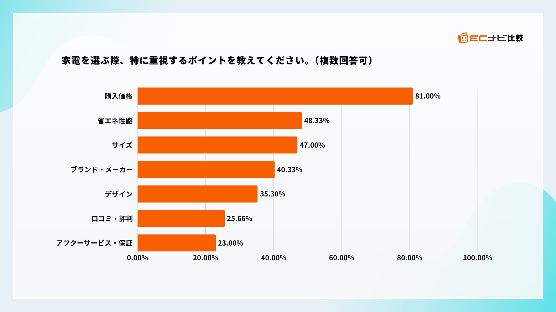 ・家電選びでは、8割以上の人が購入価格を最も重視しており、経済性が圧倒的な判断基準となっている。一方で、省エネ性能やサイズも重要な要素として挙げられている。