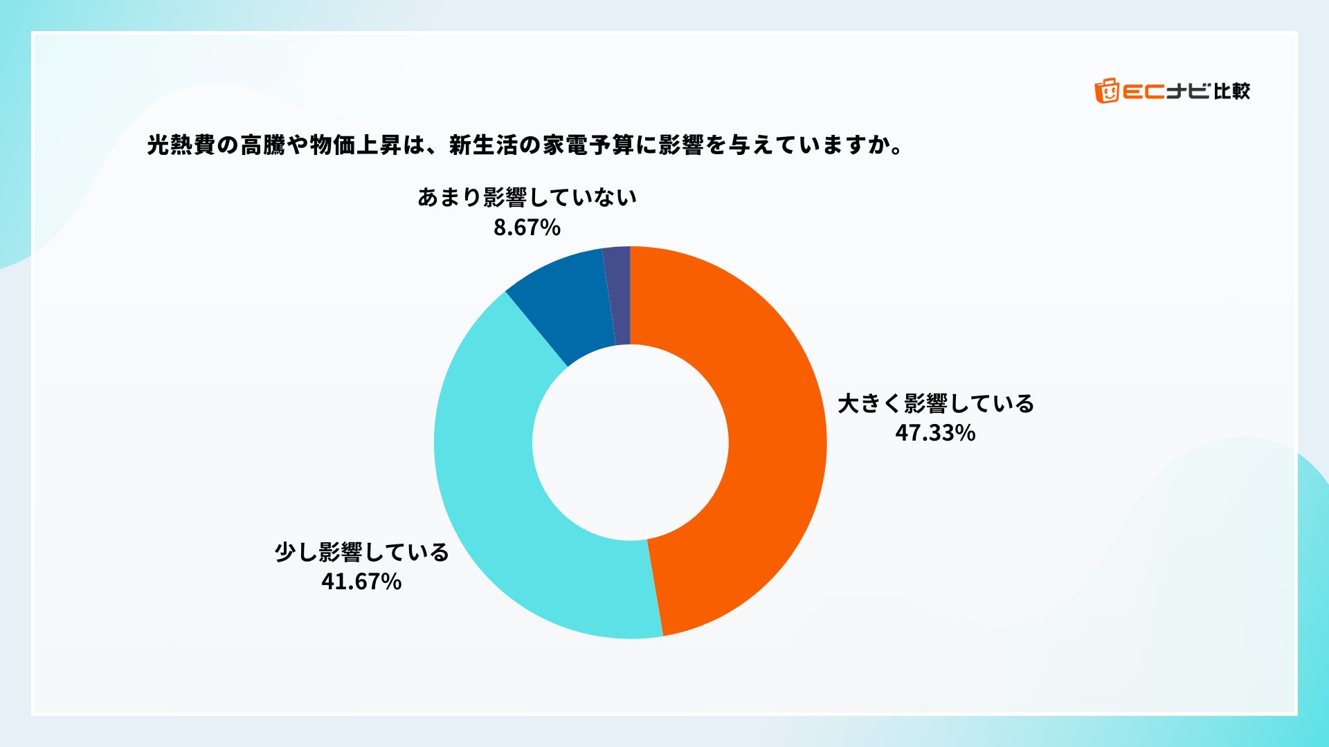 ・光熱費高騰や物価上昇により、約9割の人が新生活の家電予算に影響を受けており、現在の経済状況が家電購入予算に大きく影響している。