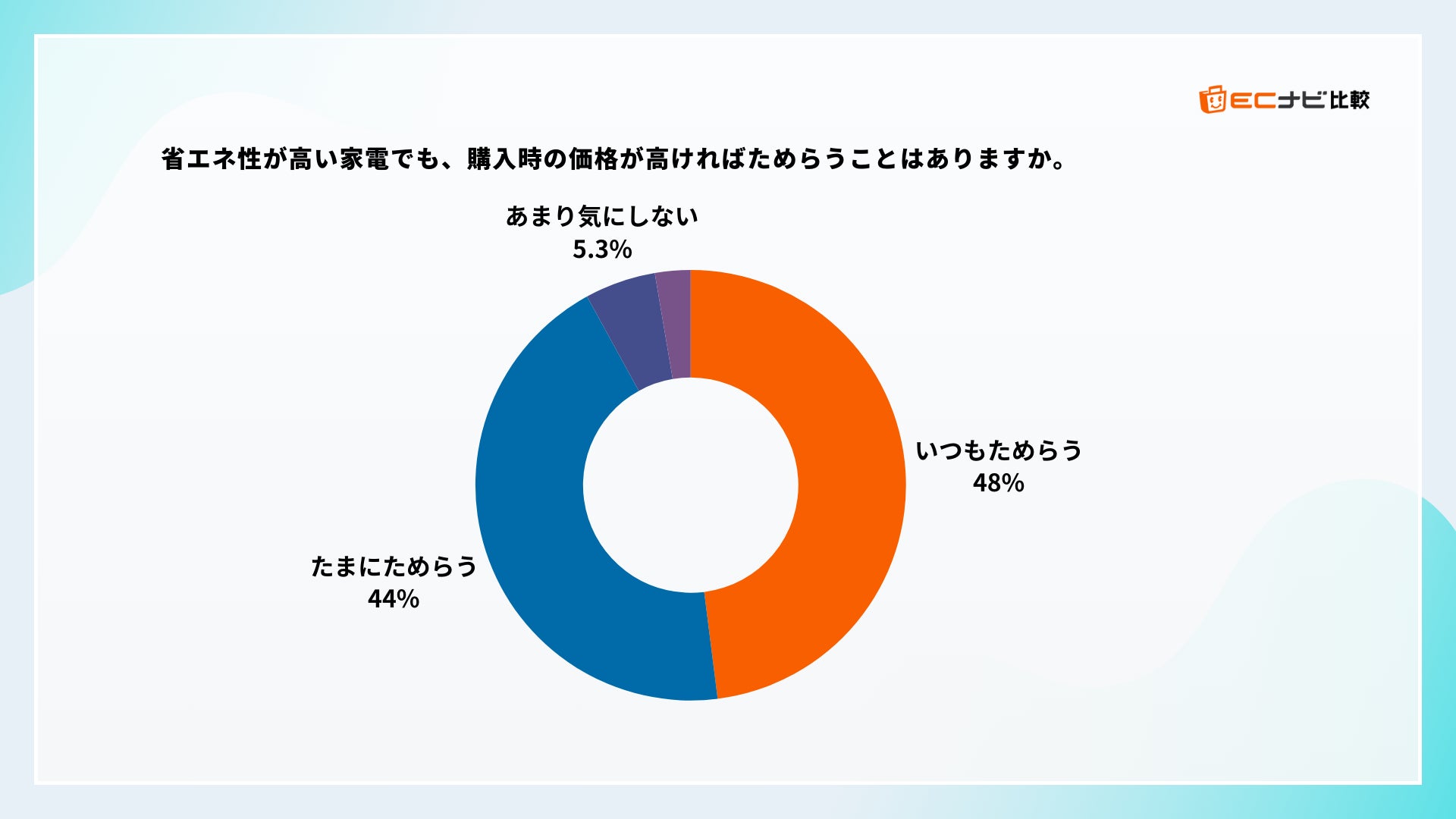 省エネ性が高い家電でも、購入時の価格が高ければためらうことはあるか聞いたところ、「いつもためらう」が48.00%、「たまにためらう」が44.00%と、合計92.00%の回答者が高価格にためらいを感じています。「気にしない」と回答した人は合計しても約8%にすぎず、省エネ性能が高くても初期投資額が大きい場合は購入判断に強く影響することが明確です。