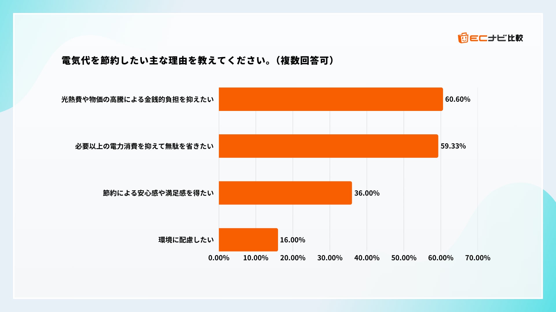 電気代を節約したい主な理由を聞いたところ、「光熱費や物価の高騰による金銭的負担を抑えたい」(60.60%)と「必要以上の電力消費を抑えて無駄を省きたい」(59.33%)は約6割と高く、経済的理由が主な動機となっています。「節約による安心感や満足感を得たい」(36.00%)という心理的側面や「環境に配慮したい」(16.00%)という社会的側面よりも実利的な理由が重視されています。