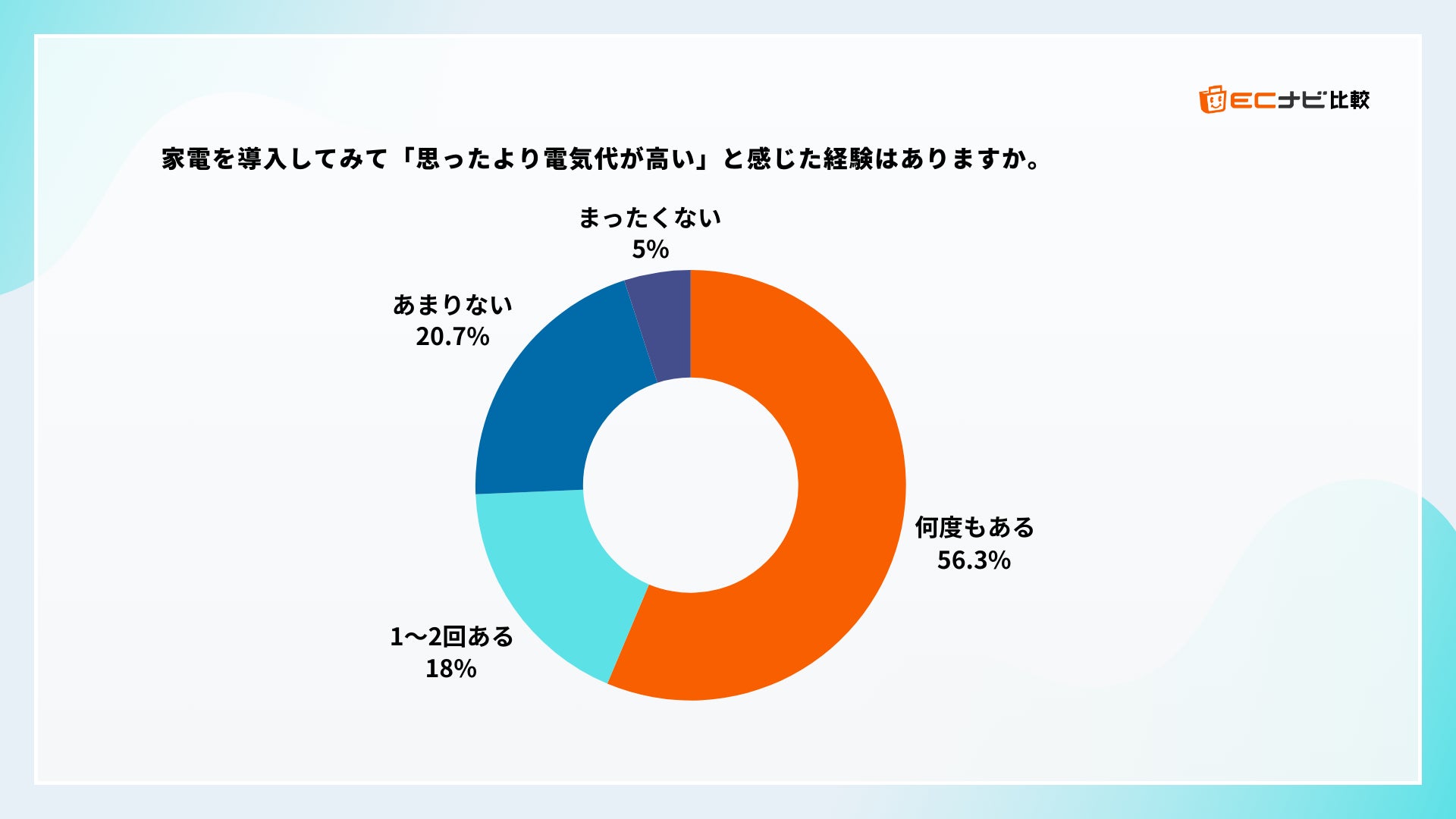 家電を導入してみて「思ったより電気代が高い」と感じた経験があるか聞いたところ、「何度もある」が56.33%と過半数を占め、「1~2回ある」(18.00%)と合わせると、約74%の回答者が家電導入後に想定以上の電気代を実感した経験があります。「まったくない」はわずか5%であり、多くの人が家電の電気代について予想外の体験をしていることが明らかになりました。
