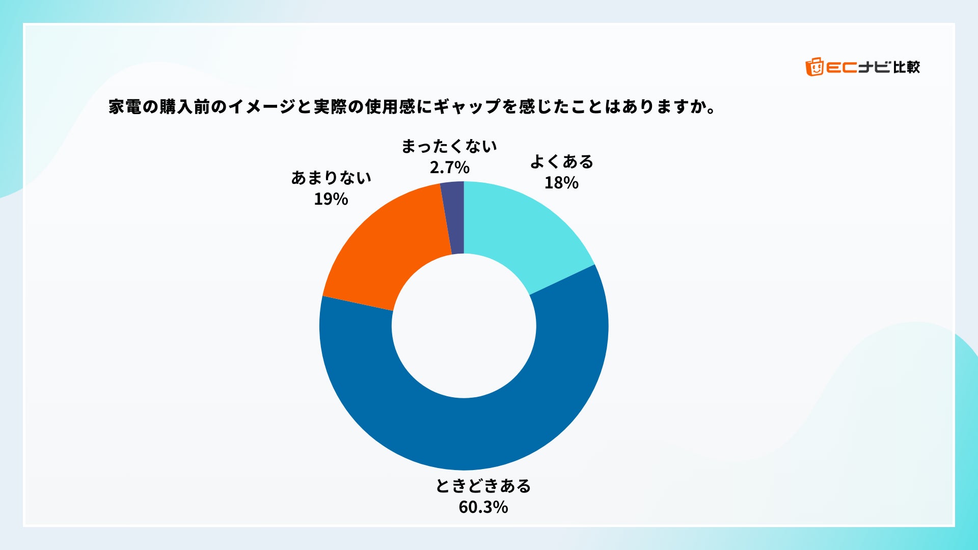 家電を購入する前のイメージと実際の使用感にギャップを感じたことがあるか聞いたところ、「ときどきある」が60.33%と最も多く、「よくある」の18.00%と合わせると約8割の回答者が購入前のイメージと実際の使用感にギャップを感じた経験があります。「まったくない」はわずか2.67%であり、ほとんどの人が何らかのギャップを経験していることがわかります。