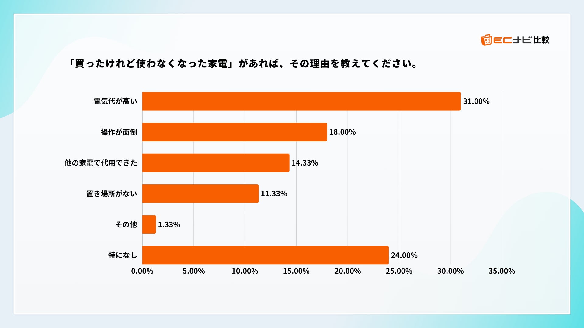 買ったけれど家電を使わなくなった理由を聞いたところ、「電気代が高い」が31%と最も多く、ランニングコストが継続使用の大きな障壁となっています。「操作が面倒」(18%)、「他の家電で代用できた」(14.33%)、「置き場所がない」(11.33%)といった実用面の理由も見られます。「特になし」も24%あり、約4分の1の回答者は購入した家電を継続して使用していることがわかります。
