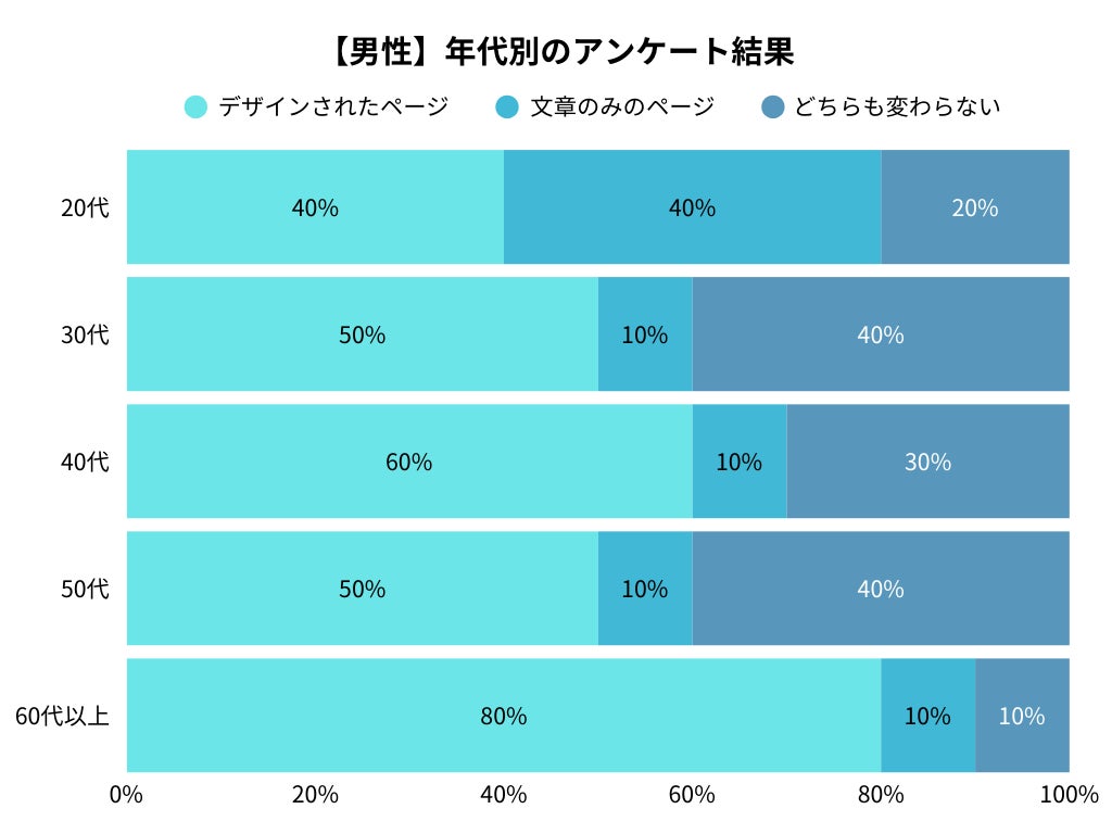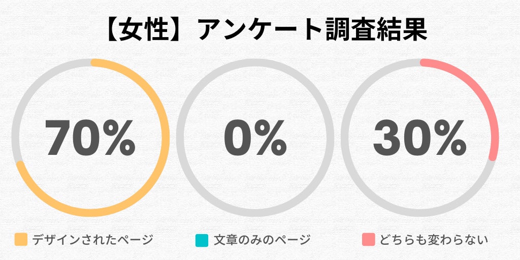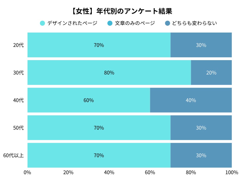 一方、女性では「デザインされたページ」が70%、「文章のみのページ」は0%、「どちらも変わらない」が30%という結果に。