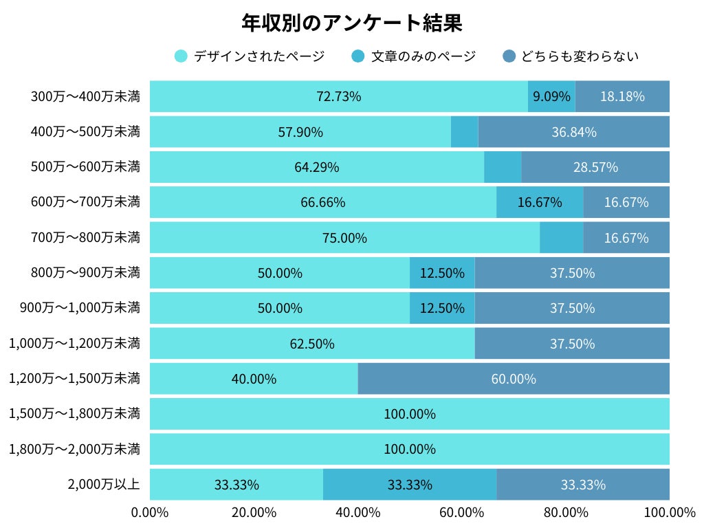 また、年収1,500万〜2,000万円未満では100%が「デザインされたページ」と回答しており、富裕層でも第一印象を重視していることがうかがえます。