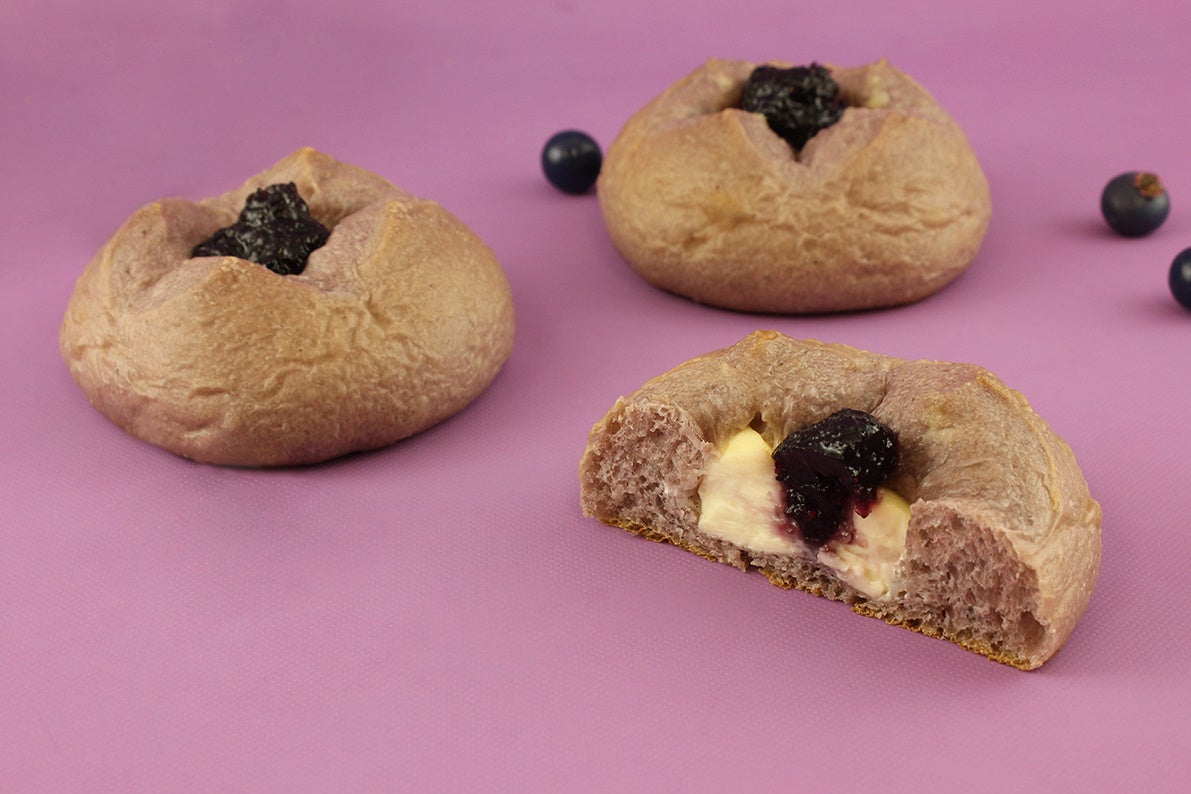 ブルーベリーピューレを練り込んだ生地にクリームチーズとブルーベリージャムを包み焼き上げました。ブルーベリーの甘酸っぱい酸味と、クリームチーズの濃厚なコクは相性抜群です。
