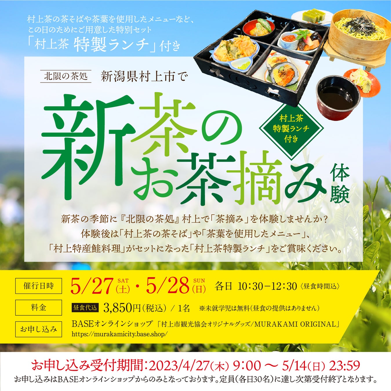 昨年早々に完売した、新潟県村上市茶畑で新茶の芽を摘む「茶摘体験」を今年も開催。茶摘み体験後は、村上茶の茶そばや茶葉を使用したメニュー、村上市特産鮭料理がセットになった「村上茶特製ランチ」を味わいます。