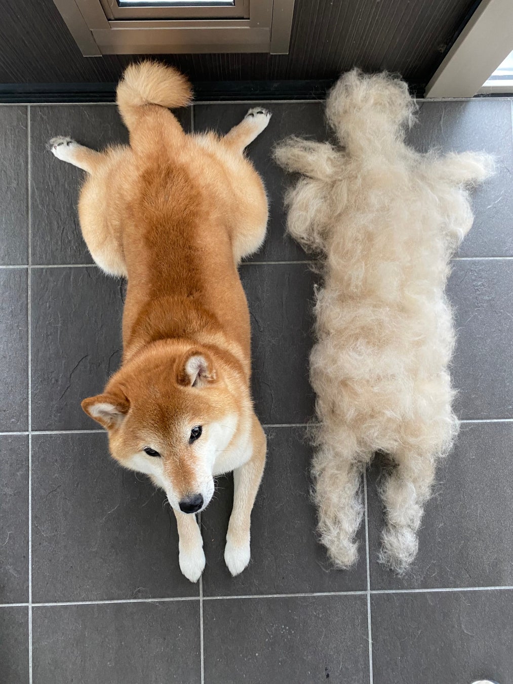 まさに分身の術! 地べたにペタンと開いた脚のリアルな感じなど、飼い主さんのこだわりに感動しました♪ 「抜け毛と並ばせて何撮ってるの?」と、付き合ってくれているぽてとも優しいです。