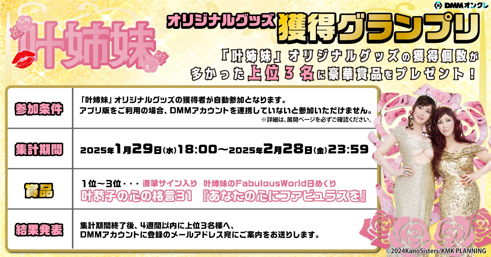 「叶姉妹」のオリジナルグッズを獲得した方の中から、獲得個数が多かった上位3名様に、直筆サイン入りの「叶姉妹のFabulous World日めくり」をプレゼントします。