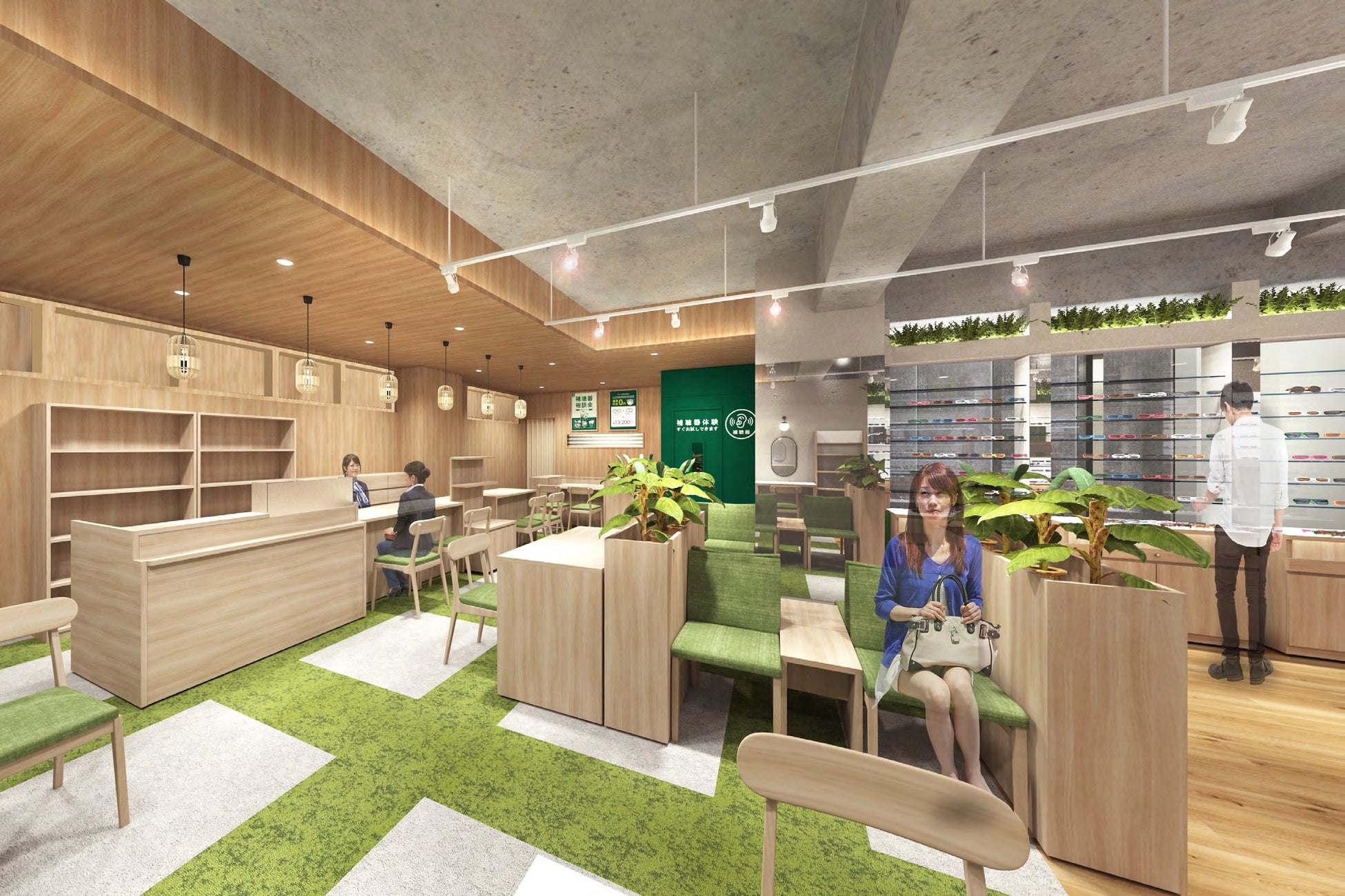 ファサードデザインは、パイロンサインとサイネージを採用し通りからも目を惹くデザイン。商品がより見やすくなるよう光る造作ディスプレイを配置し高級感を演出しました。店舗奥に位置する検眼コーナーと補聴器サロンは、木目の天井と緑色のアクセントがポイントのカーペットで、ゆったりと居心地の良い空間になっており、リラックスして測定を受けることができます。