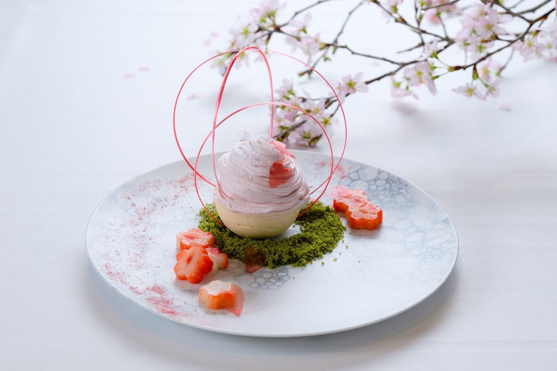 シェフパティシエールの安部璃南(あべ・りな)が作り上げたのは、桜の咲く春の華やかな景色を表現した一皿。満開の桜をイメージした淡いピンク色のモンブランに鮮やかな赤の苺を合わせました。完熟した苺の甘く爽やかな香りと繊細な桜の風味が口いっぱいに広がり、春の訪れを感じていただるデザートです。