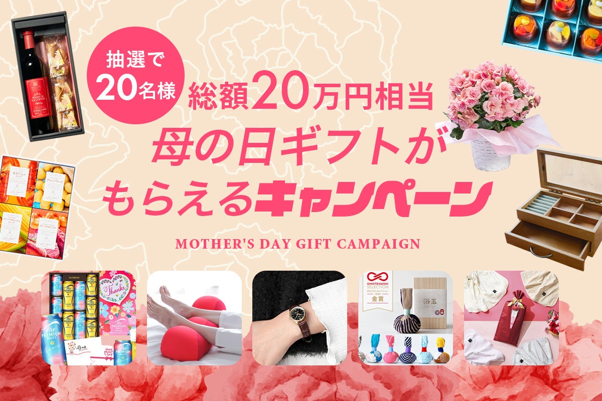 今回のキャンペーンでは、感謝の気持ちを込めて贈りたい、選りすぐりの母の日ギフト20点(総額20万円相当)をご用意。定番のカーネーションや花束、見た目も華やかなスイーツセット、癒やしの入浴剤や香りグッズ、さらには今話題のスキンケアアイテムまで、バラエティ豊かなラインナップが揃っています。