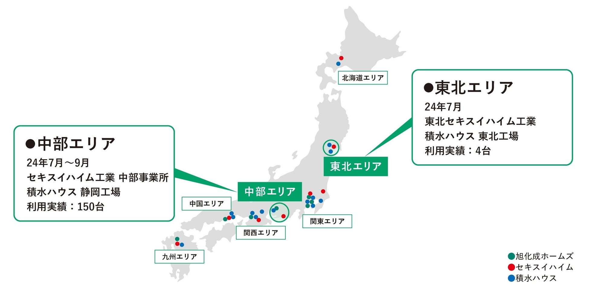 既に東北エリアで24年7月に東北セキスイハイム工業・積水ハウス東北工場の2拠点で4台、中部エリアで24年7月~9月にセキスイハイム工業中部事業所・積水ハウス静岡工場の2拠点で150台の車両の共同利用が始まっています。