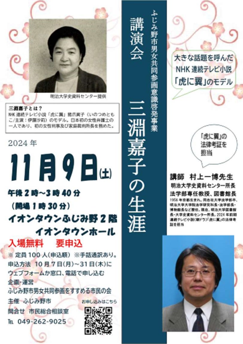 NHK連続テレビ小説「虎に翼」のモデルとなった日本初の女性弁護士のひとりであり、初の女性判事および家庭裁判所長の三淵嘉子さんの生涯について、「虎に翼」の法律考証を担当された明治大学史資料センター所長で明治大学法学部専任教授の村上一博さんをお招きし、ふじみ野市男女共同参画意識啓発事業として講演会を行います。