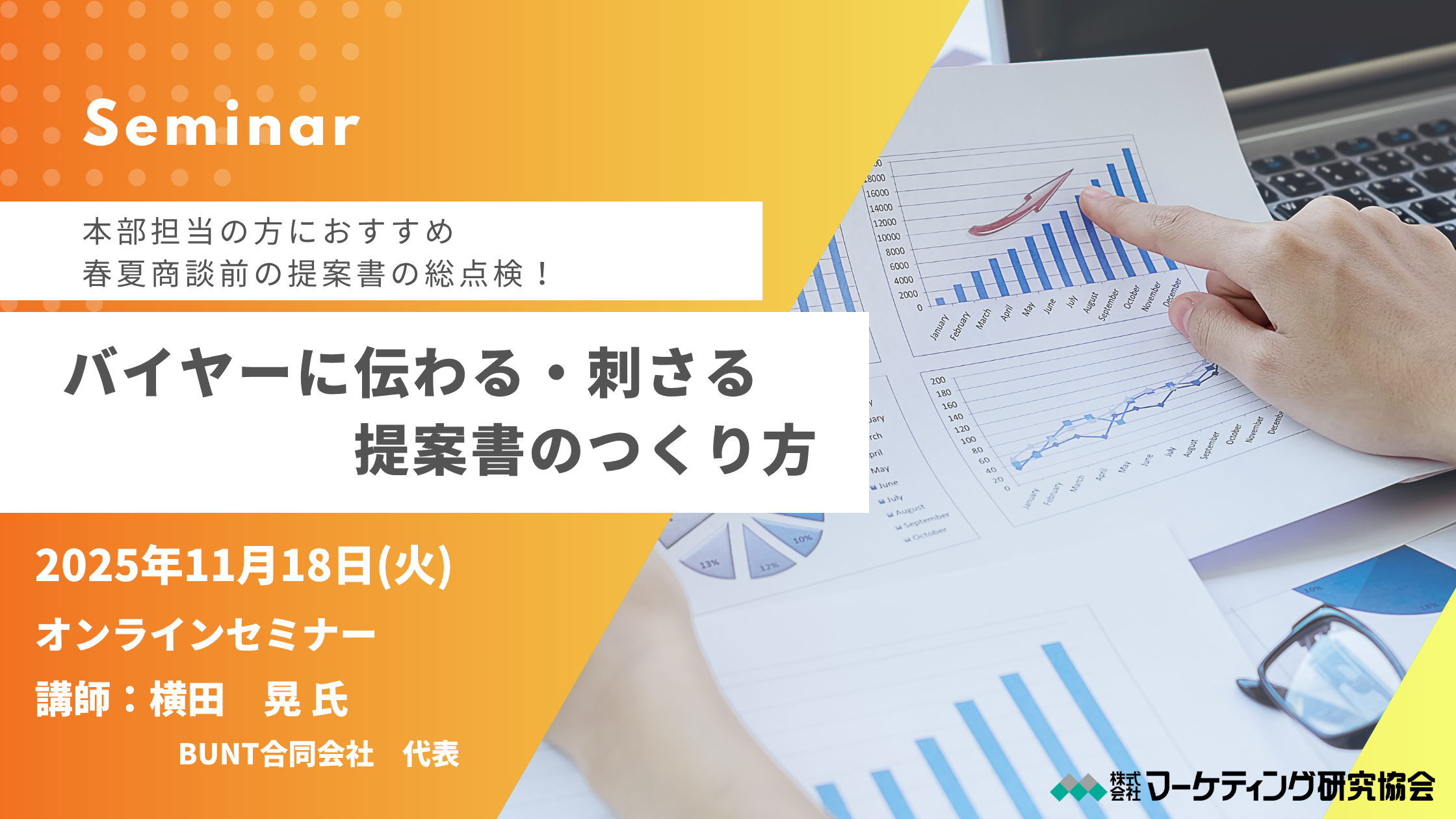 株式会社マーケティング研究協会は2025年11月18日オンラインセミナー「春夏商談前の提案書の総点検!バイヤーに伝わる・刺さる提案書のつくり方」を開催します。