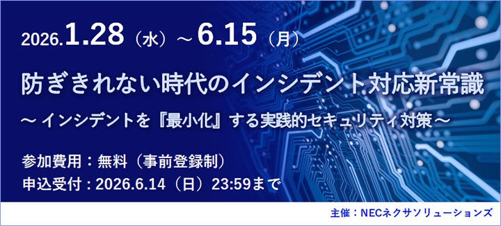 NECネクサソリューションズは、3月31日(火)まで公開していました「防ぎきれない時代のインシデント対応新常識」セミナーの視聴期間を、ご好評につき6月15日(月)まで延長します。
