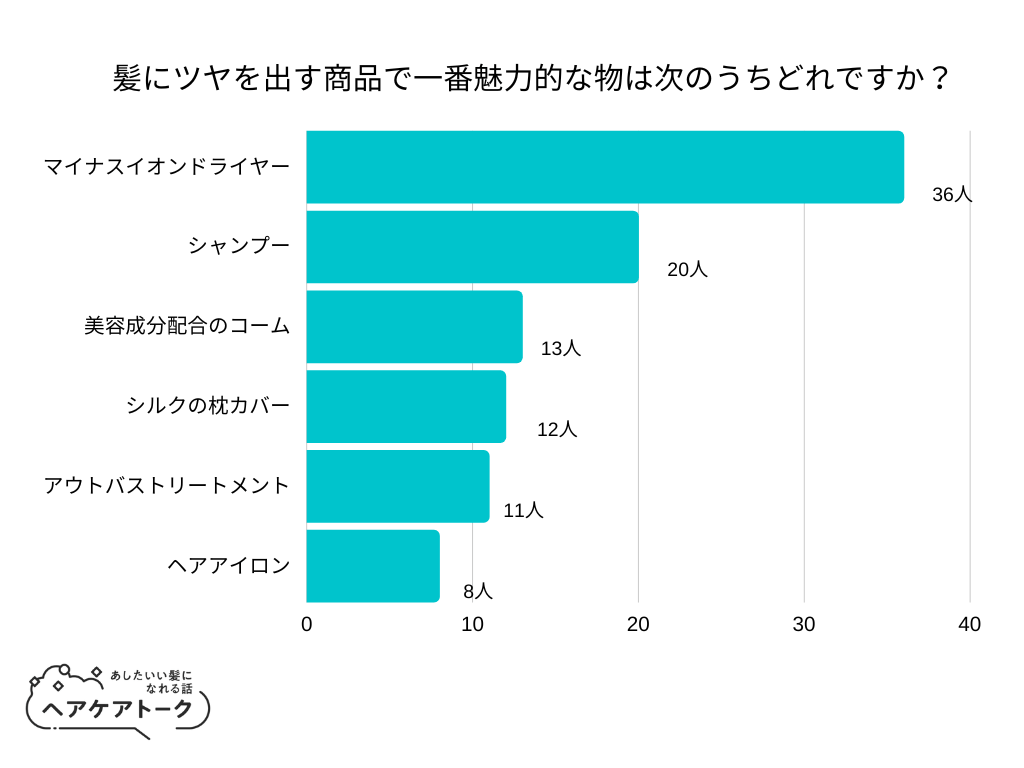 株式会社AWA(https://a-w-a.co.jp/)が運営するヘアケア情報メディア「ヘアケアトーク」(https://haircare-talk.com/ )は、日本全国の10代以上の女性を対象に「髪にツヤを出す商品で一番魅力的な物は次のうちどれですか?」についてのアンケート調査を実施しました。