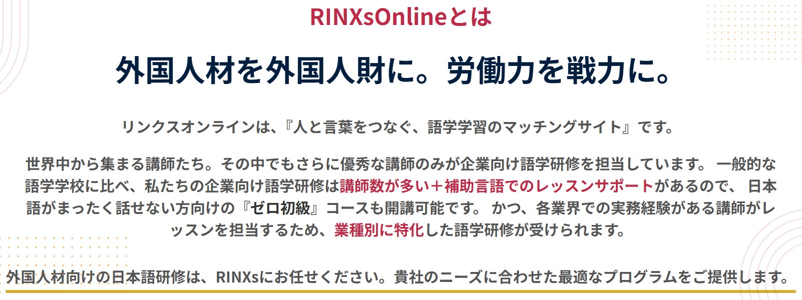 「RINXsOnline」は、企業や業界の実務内容に即した「仕事で使う日本語」の習得に対応したオンライン教育サービスです。日本が二国間協定を結ぶ17か国の言語と、英語・中国語・スペイン語・アラビア語などの主要言語に補助言語を用いて国内で唯一対応しています。業界や使用言語に応じて多様な企業ニーズに応えるカスタマイズプランが特徴です。