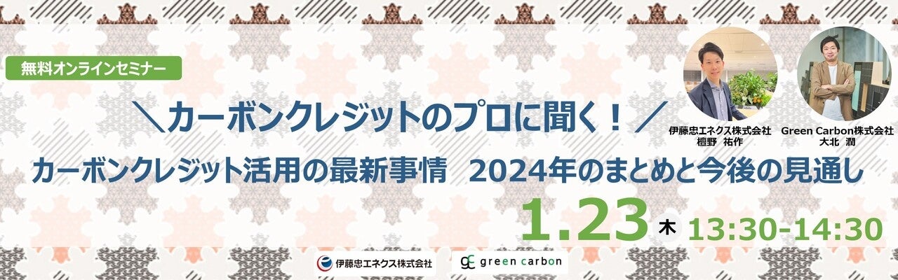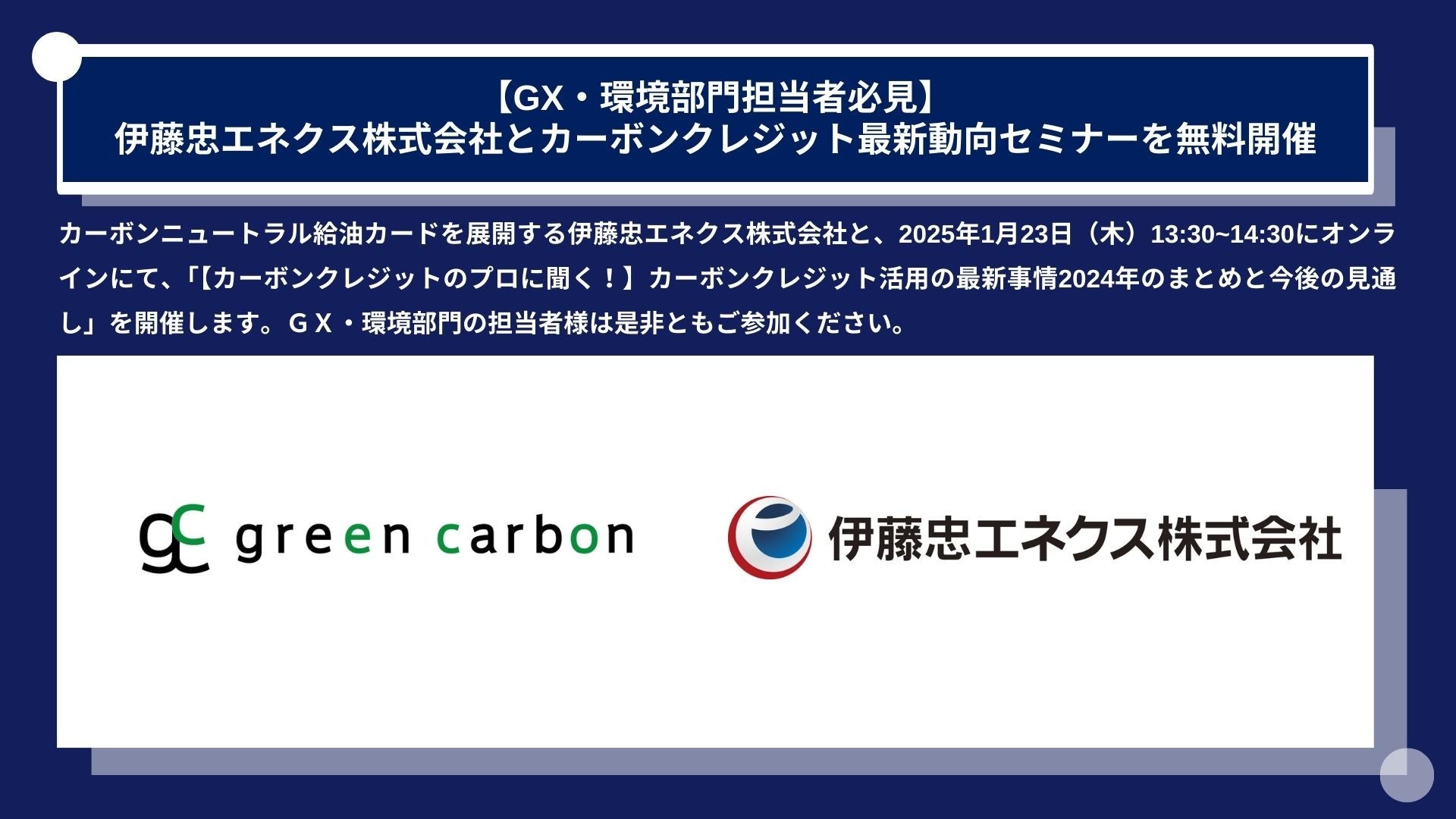 ネイチャーベースのカーボンクレジット創出販売事業を展開するGreen Carbon株式会社(代表取締役:大北潤、以下Green Carbon(読み;グリーンカーボン))は、カーボンニュートラル給油カード※1を展開する伊藤忠エネクス株式会社(代表取締役社長CEO:𠮷田朋史、以下伊藤忠エネクス)と、2025年1月23日(木)13:30~14:30オンラインにて、「【カーボンクレジットのプロに聞く!】カーボンクレジット活用の最新事情2024年のまとめと今後の見通し(以下、本セミナー)」を開催します。GX・環境部門の担当者様は是非ともご参加ください。