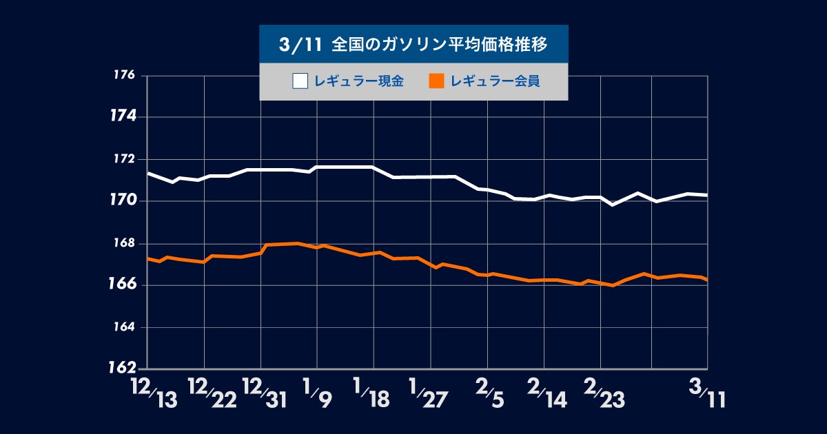 3月11日(月) 時点のレギュラーガソリンの全国平均は、170.3円となり先週から0.3円の値上がり。8週間ぶりの値上がりとなりました。