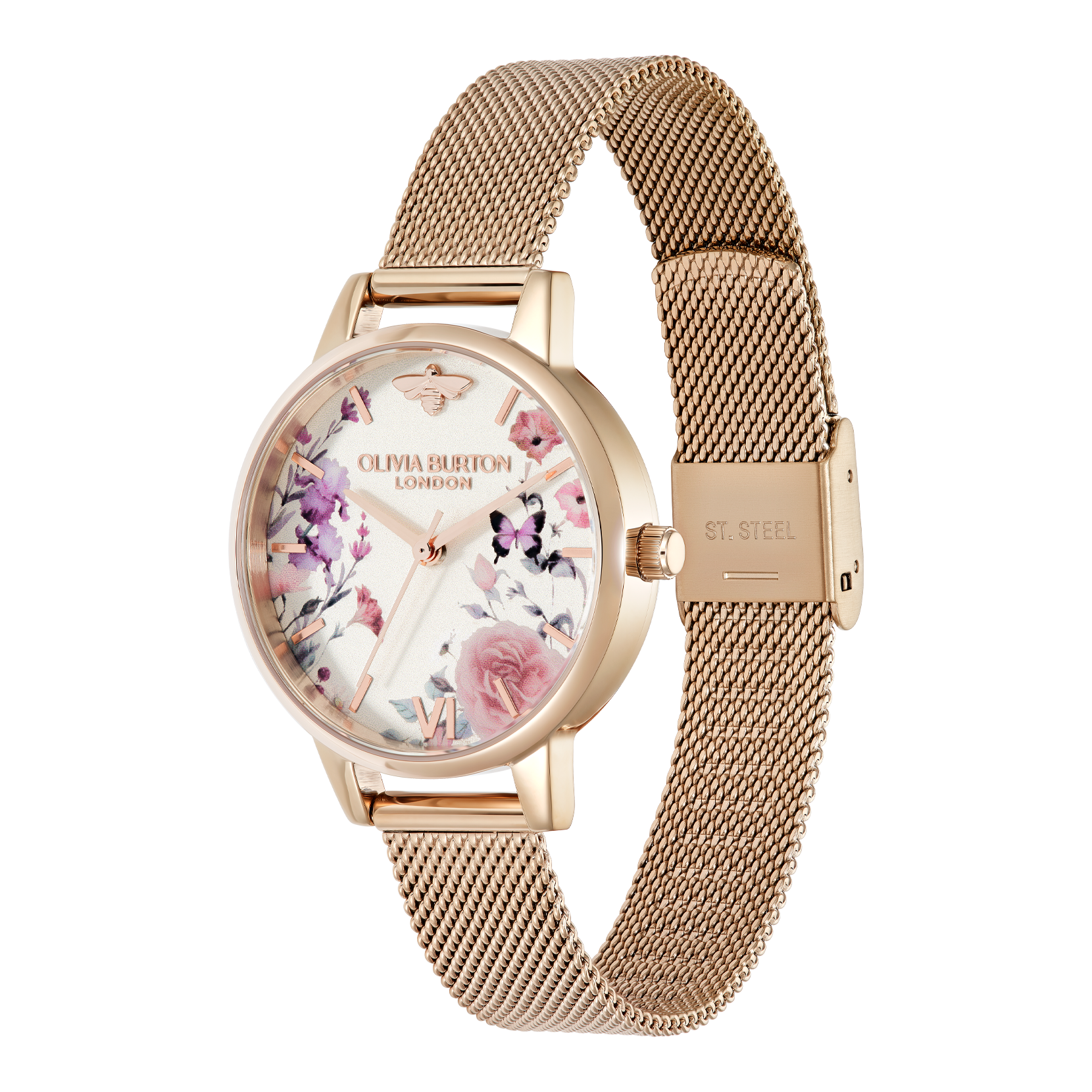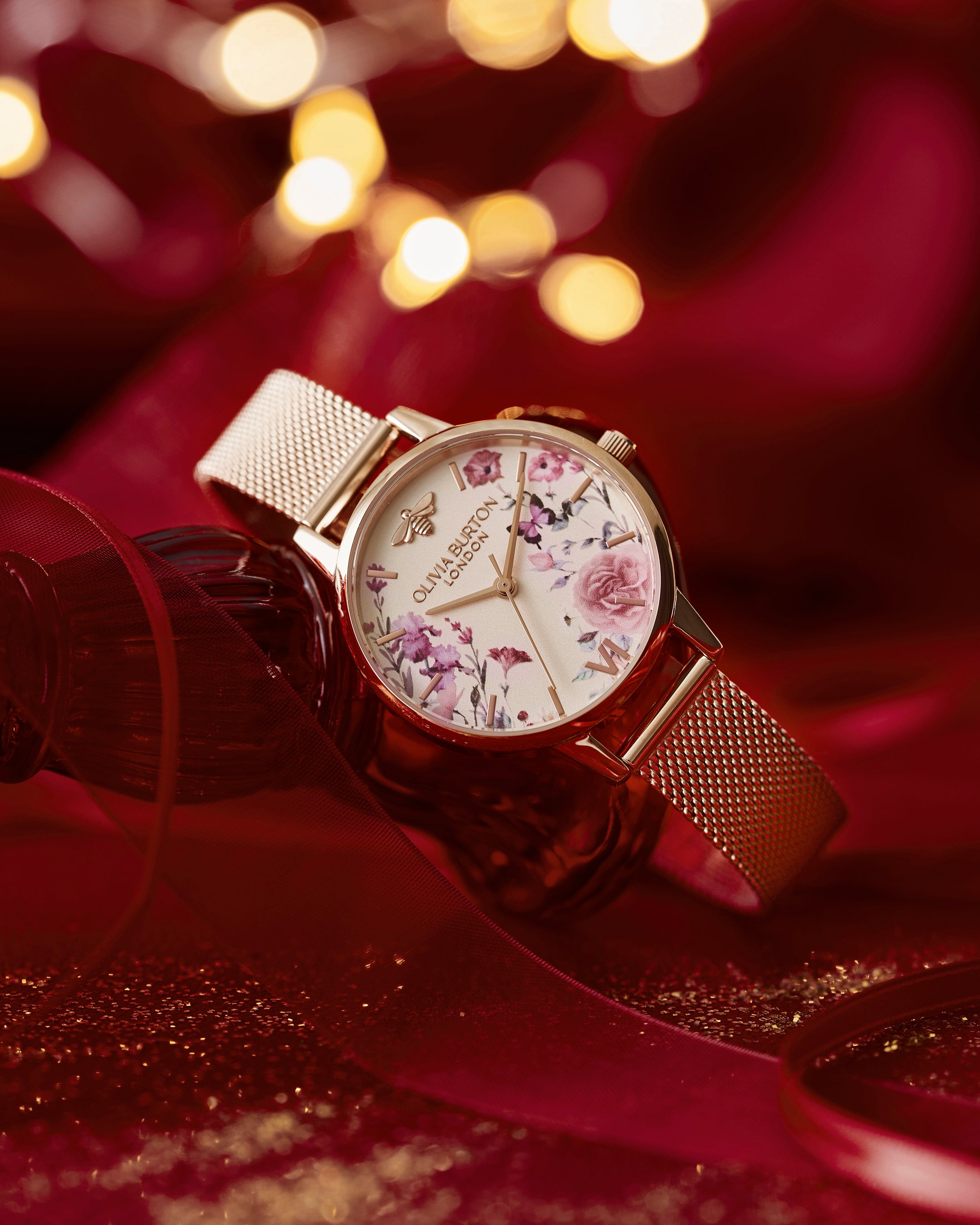ブランドを象徴する繊細な手描きのフラワーモチーフが、まるで冬の庭の花々をそのまま閉じ込めたように文字盤いっぱいに広がり、柔らかな光をまとって手元を彩ります。立体的な蜂のモチーフを12時位置に配したアイコニックなデザインは、可憐さの中にさりげない遊び心を添え、見るたびに心ときめく仕上がりに。ライトグレーレザーにローズゴールドを合わせた優しい輝き、深みのあるフォレストグリーンとクラシカルなゴールドの組み合わせ、そしてローズゴールドメッシュが放つフェスティブな華やかさ。3つのバリエーションが、それぞれ異なる個性で冬の装いを引き立てます。花の美しさ、自然の息づかい、そして英国らしいロマンティシズム。オリビア・バートンが描く「冬の庭」は、手元に小さな物語を咲かせます。