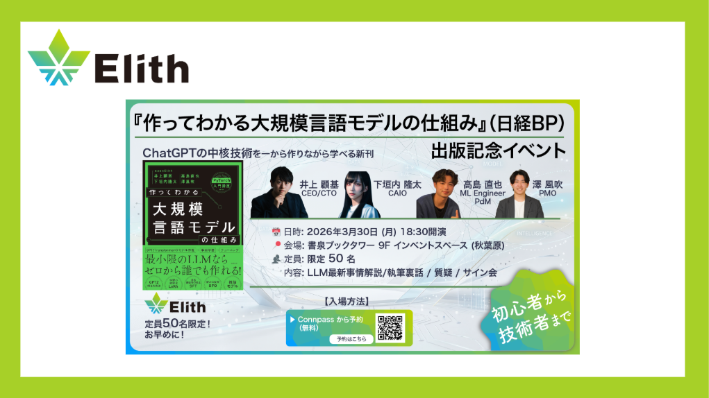 株式会社Elithは、2026年3月20日発売の書籍『作ってわかる大規模言語モデルの仕組み』(日経BP)出版を記念し、書泉ブックタワー(秋葉原)にてセミナーイベントを開催いたします。
