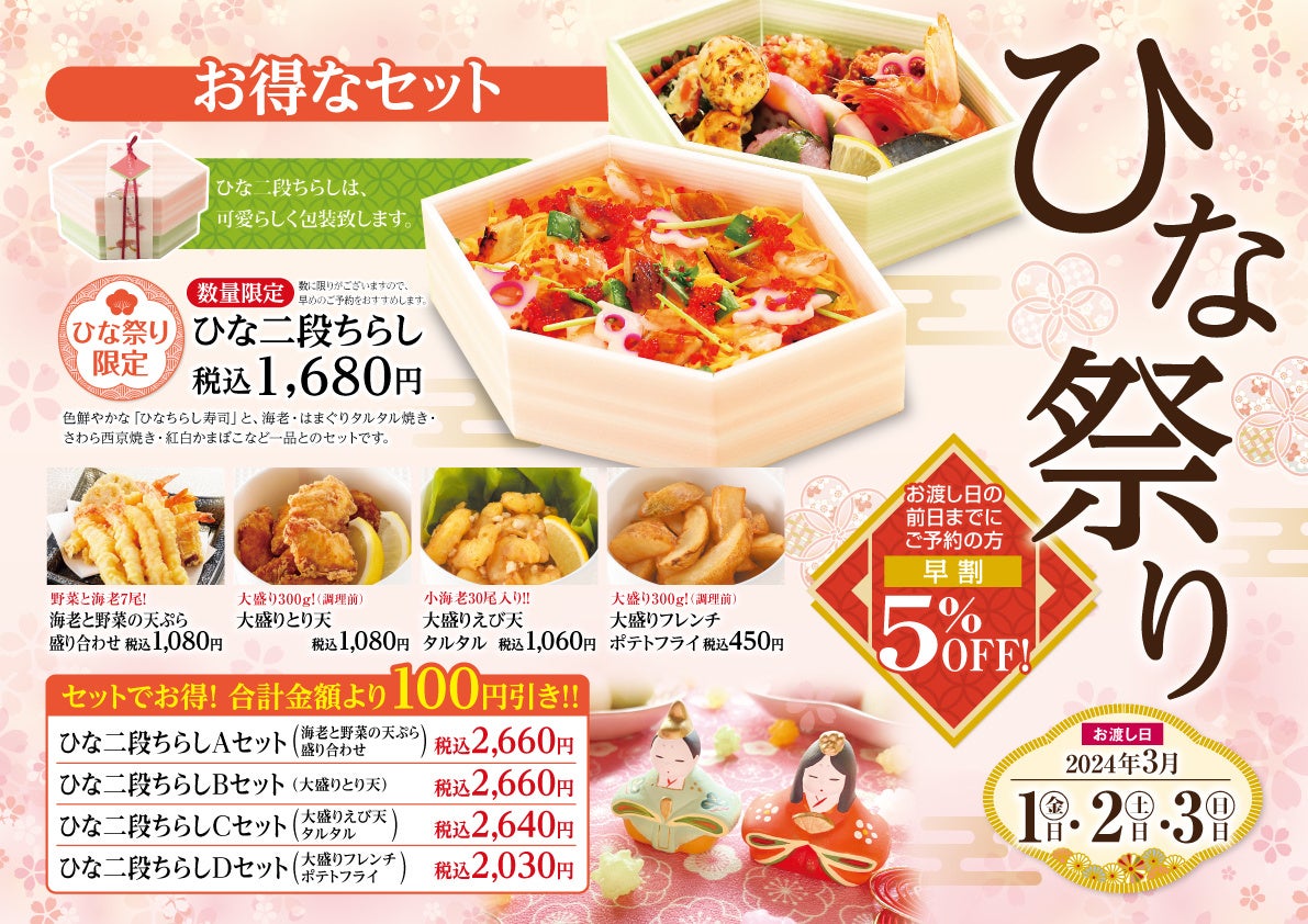 ひな二段ちらしとサイドメニューをセットにした商品がお得です。