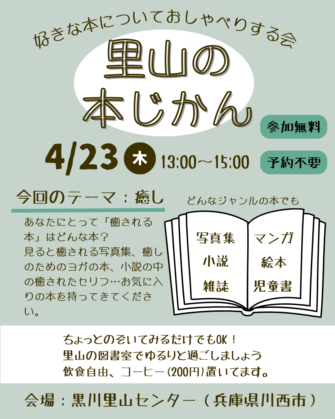「里山の本じかん」は、お気に入りの本を持参し、参加者同士で紹介し合うイベントである。初回のテーマは「癒し」。写真集、エッセイ、小説、絵本、マンガなどジャンルを問わず、心がほっとする一冊を共有する。中学生以上を対象とし、申込み不要、入退場自由で気軽に参加できる。