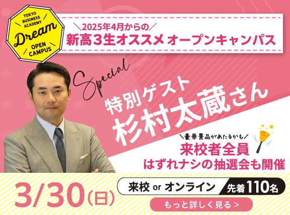 杉村太蔵氏が、特別講師に就任!「夢→挑戦→実現」をテーマに、高校生に特別授業。3月30日(日)に開催【東京ビジネス・アカデミー】