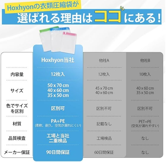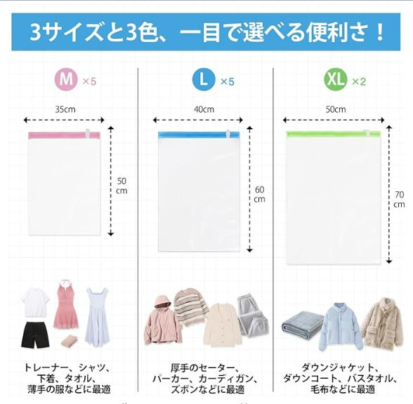 Hoxhyonの圧縮袋は、収納するアイテムに合わせて3つのサイズ展開をしています。XLサイズ(50*70cm)は、ダウンジャケットや毛布など大型アイテムに最適。Lサイズ(40*60cm)は、セーターやパンツなどの中型アイテムにぴったり。Mサイズ(35*50cm)は、下着やタオル、小物類の収納に適しています。各サイズには異なるカラーが設定されているため、袋のサイズをすぐに見分けられ、さらに便利です。