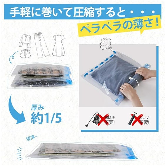 ポンプ不要で手軽に使える手巻き圧縮袋