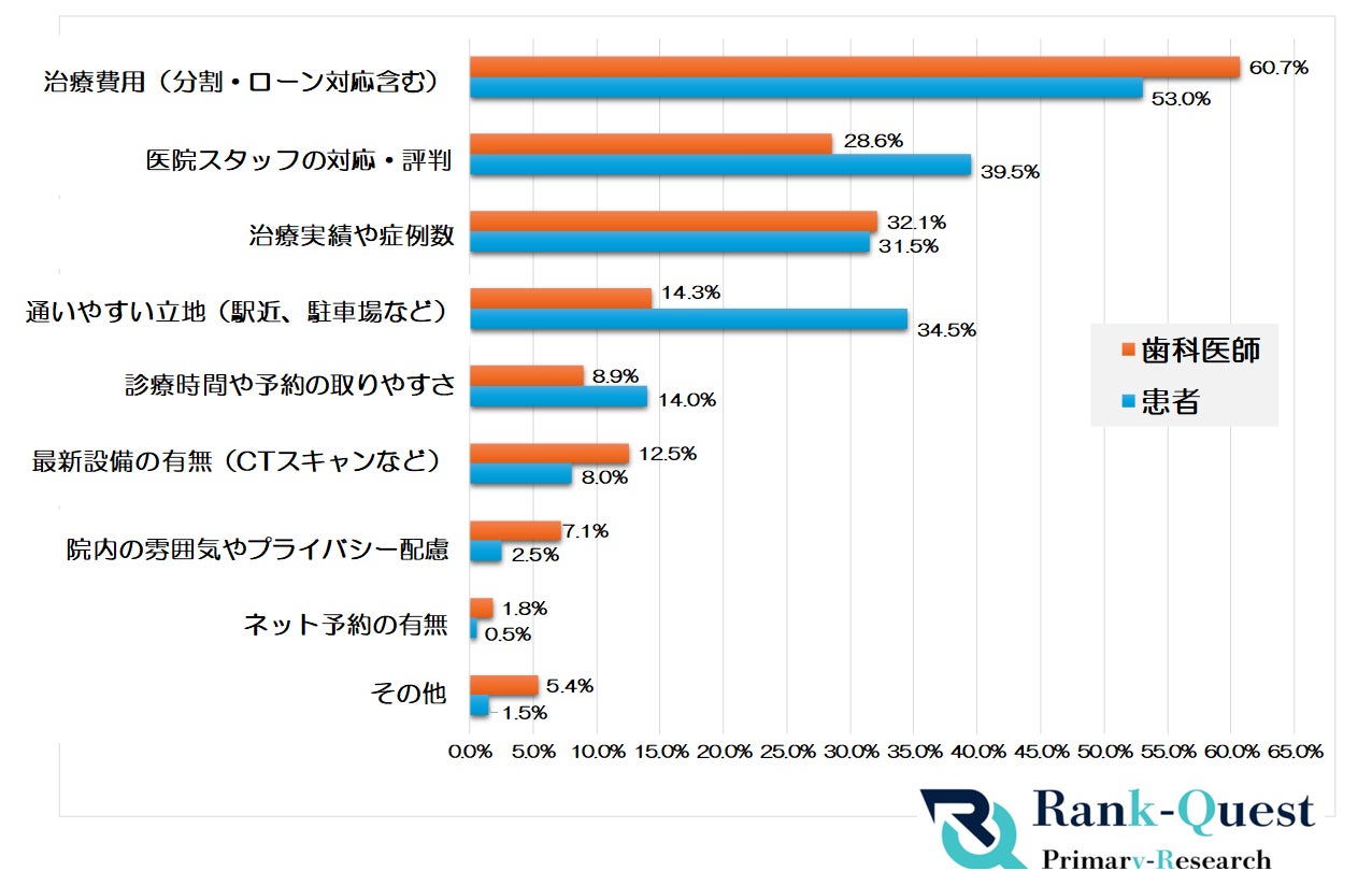 一方、上位以外の項目では「診療時間や予約の取りやすさ」が14%、「最新設備の有無」が8%と一部の患者にとどまり、「院内の雰囲気やプライバシー配慮」は2.5%、「ネット予約の有無」0.5%と重視する人はごく少数でした。