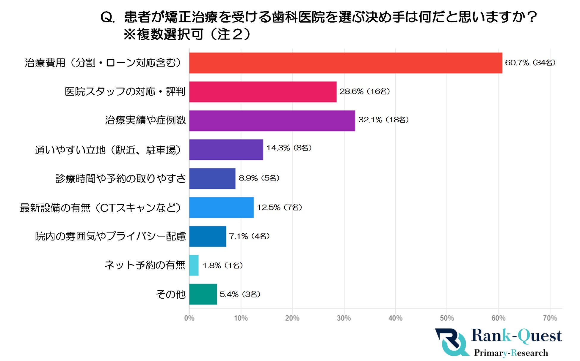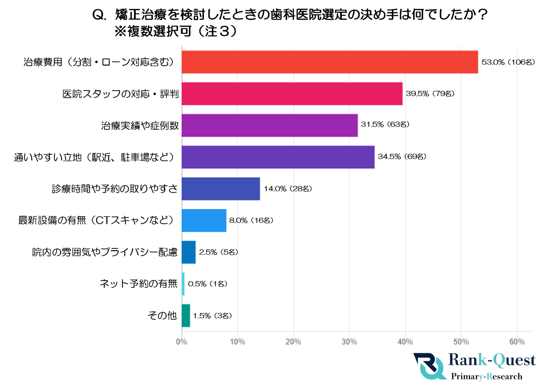 そこで、Google検索【SEO対策】で1位を獲得した実績(注1)を持つランクエスト(https://rank-quest.jp/column/column/how-to-seo/ )は、矯正治療を行う独立開業歯科医師56名と矯正治療を受けた患者200名を対象に「歯科医院の選択の決め手」に関する調査を実施しました。