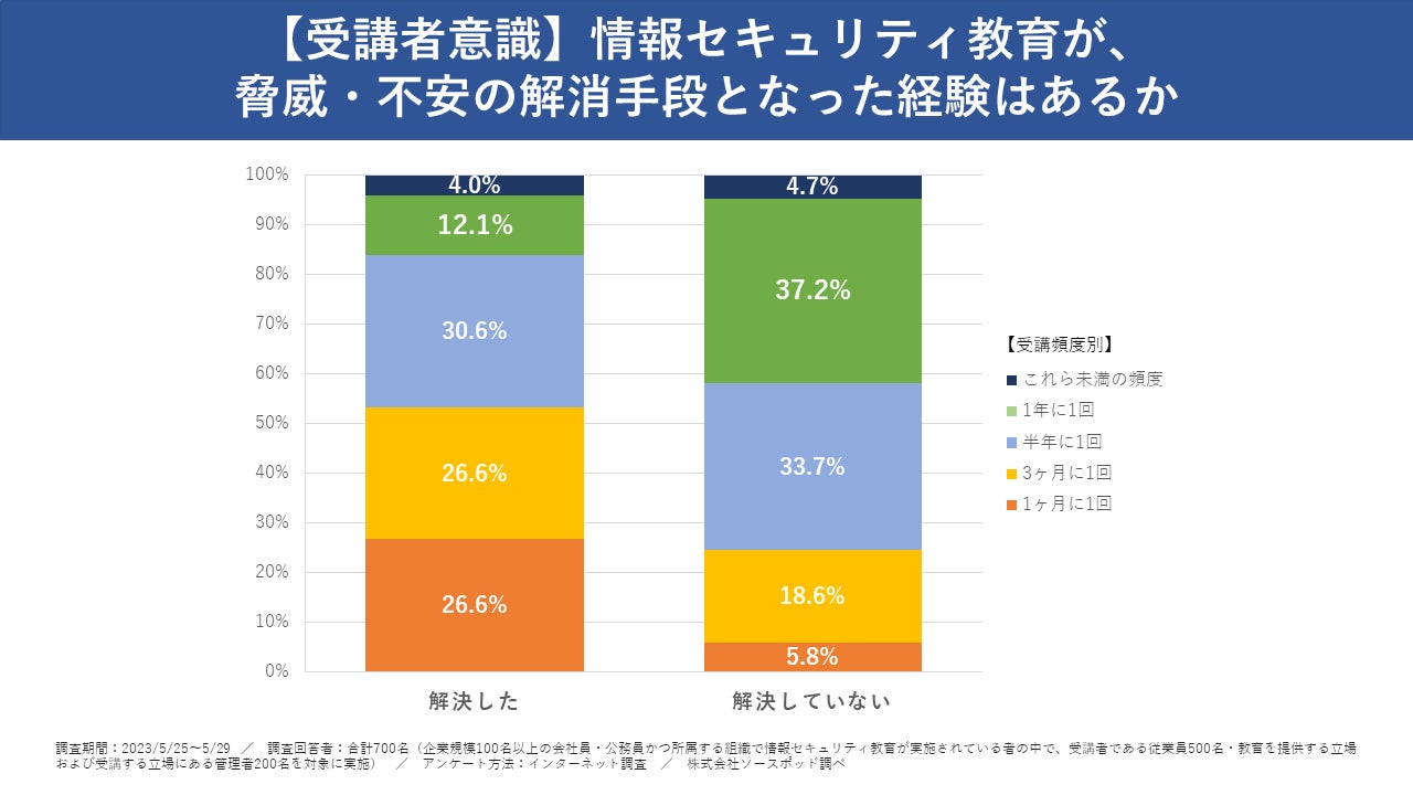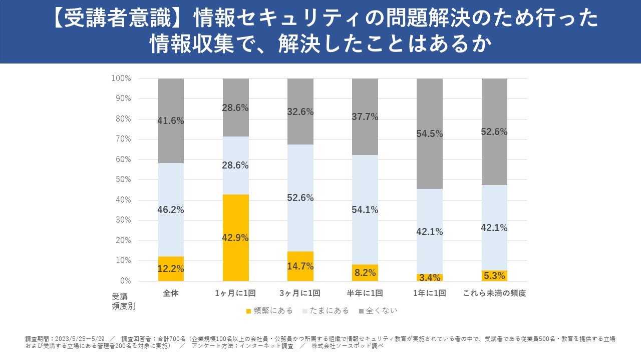 情報セキュリティ教育が脅威・不安の解消手段になったのは、受講者全体の25%どまり。しかし、高頻度に教育を受けた者ほど、教育を通じた問題解決経験を平均より上回り持っている傾向。