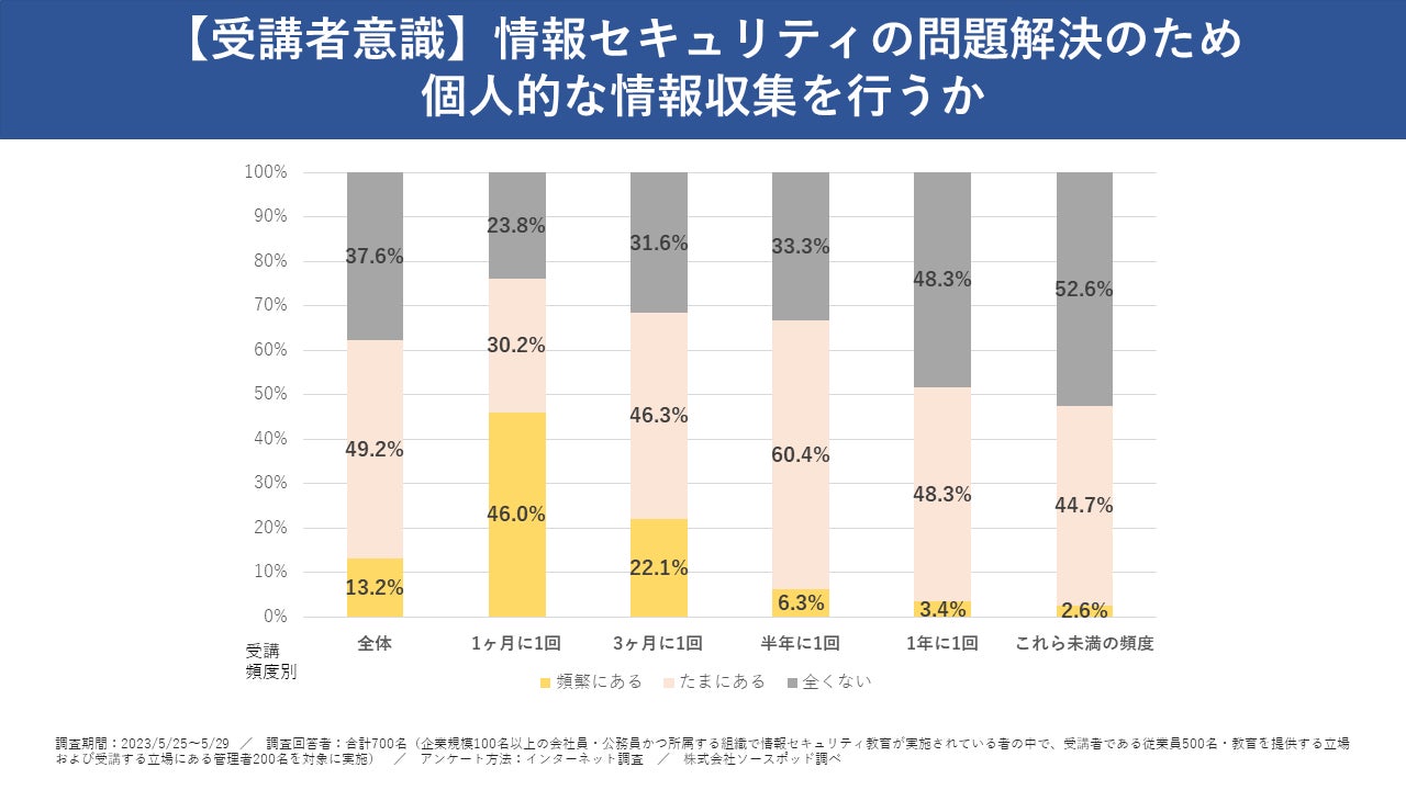 これらのデータを踏まえると、頻繁に情報セキュリティ教育に触れることで、問題解決アクションにつながる従業員意識を醸成できる可能性が極めて高いと考えられる。