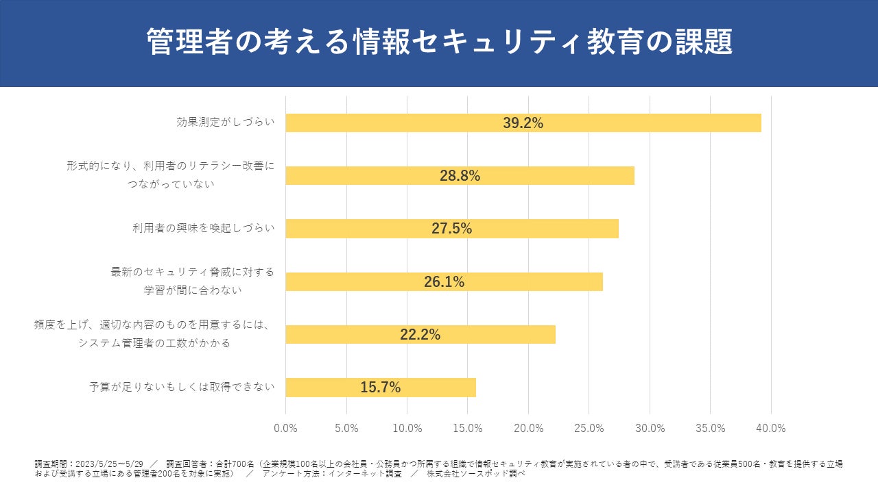 一方、管理者側の情報セキュリティ教育の課題として、教育効果の可視化や運用工数の削減、コンテンツの質について等が挙がっており、効果を高く得られる高頻度の教育実施にあたり、課題が存在することも判明しております。