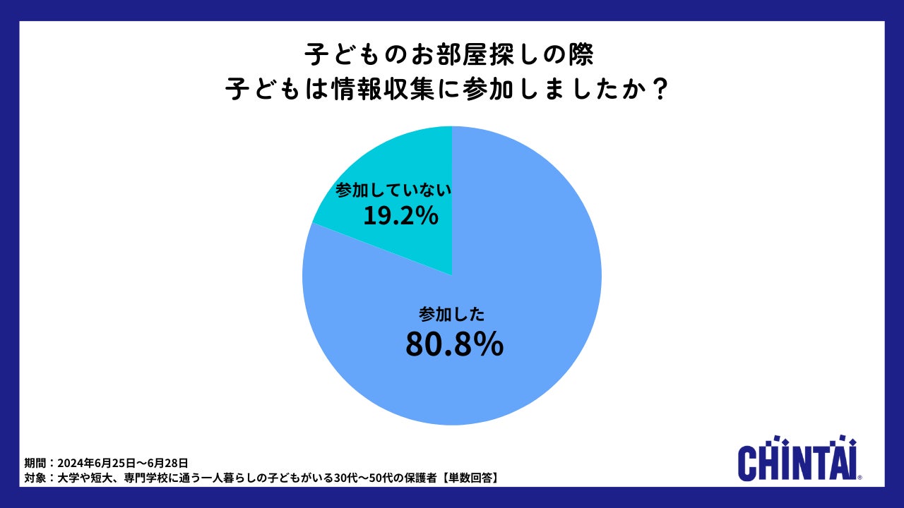・お部屋探しの情報収集は、保護者主導であるケースが77.0%にのぼりました。また、80.8%が子どもも情報収集に参加していることがわかりました。