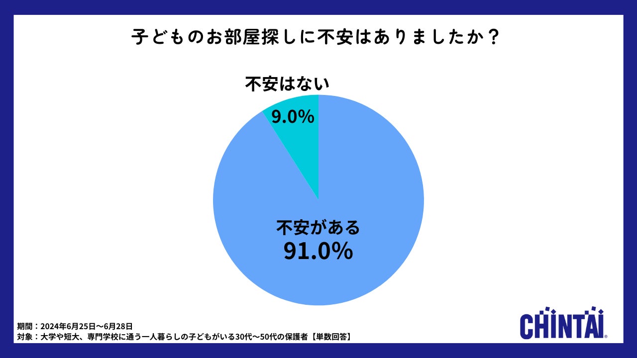 ・子どものお部屋探しについて、保護者の91.0%が「不安がある」と回答しました。