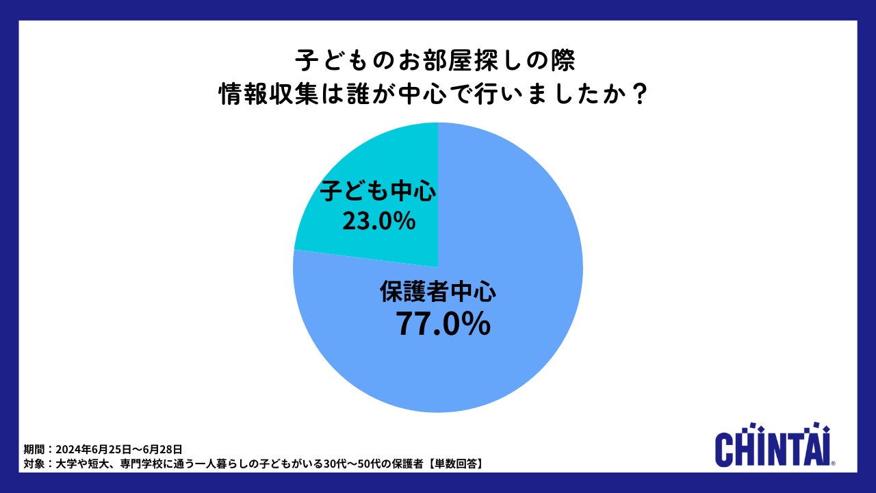 子どものお部屋探しでの情報収集では、「保護者中心」が77.0%となり、保護者が主導的に動くケースが多いことが明らかになりました。一方で、「子ども中心」との回答は23.0%にとどまり、多くの場合、保護者が主導権を握っている様子がうかがえます。