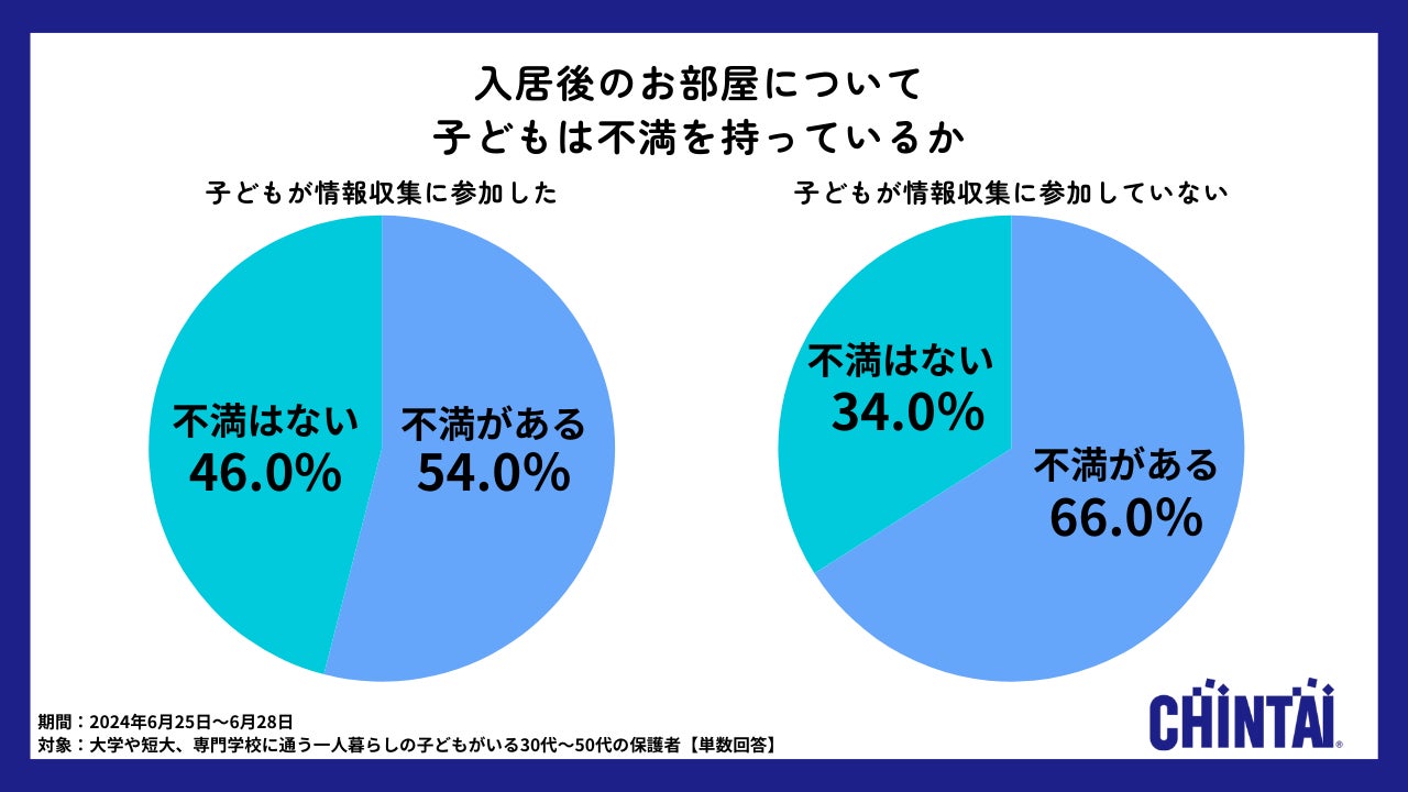 入居後のお部屋に対する不満の調査では、子どもが情報収集に参加した場合、54.0%にとどまりましたが、参加していない場合では66.0%に上昇する結果となりました。また、不満がないと回答した割合は、子どもが情報収集に参加した家庭で46.0%、参加していない家庭では34.0%と、子どもの参加が不満の軽減につながる傾向が見られました。