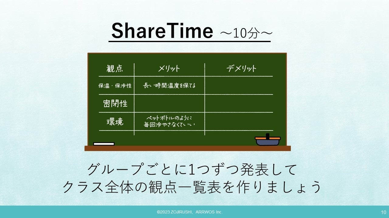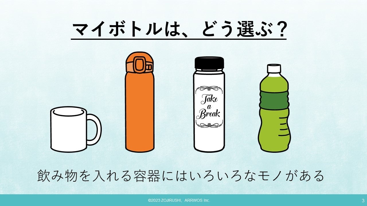 そこで、象印マホービンのマイボトルに関する知見・ノウハウと ARROWS の教材開発・提供の強みを活かし、学生にとって身近なアイテムである「マイボトル」の内容を盛り込んだ教材の制作、授業への導入を考えました。