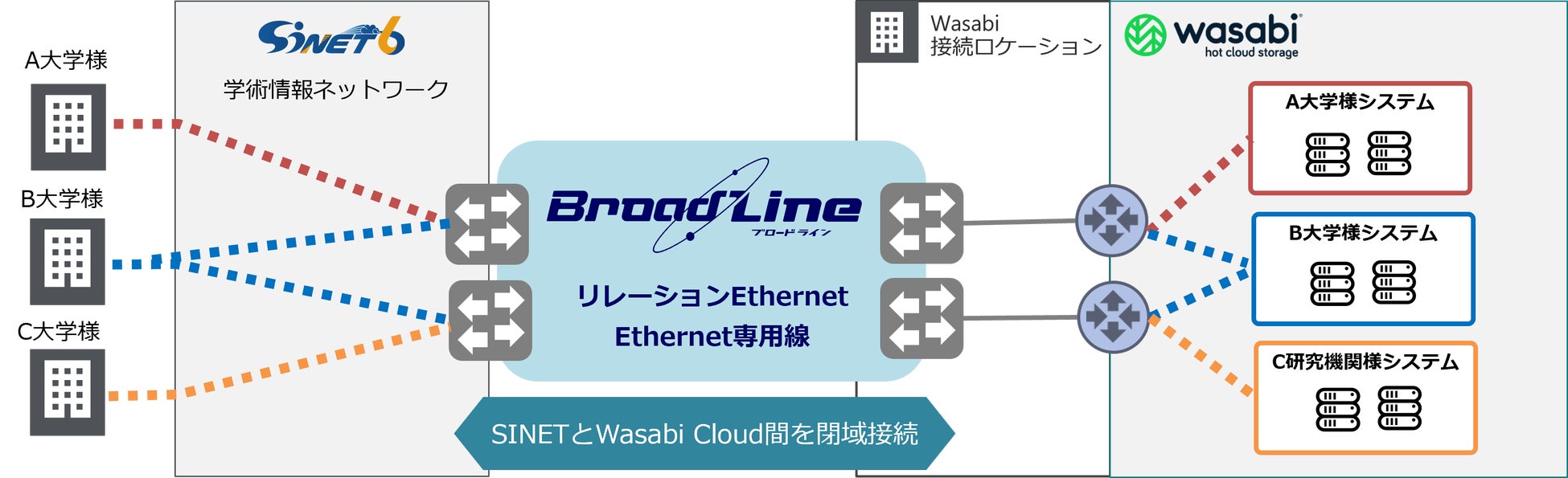 大学や研究機関のお客様向けに、SINETを経由してWasabiへの閉域接続サービスの提供を開始いたします。これにより、SINET加入機関は新たに専用回線を手配することなく、SINETを経由してWasabi へのセキュアで安定した仮想ネットワーク接続を実現いたします。