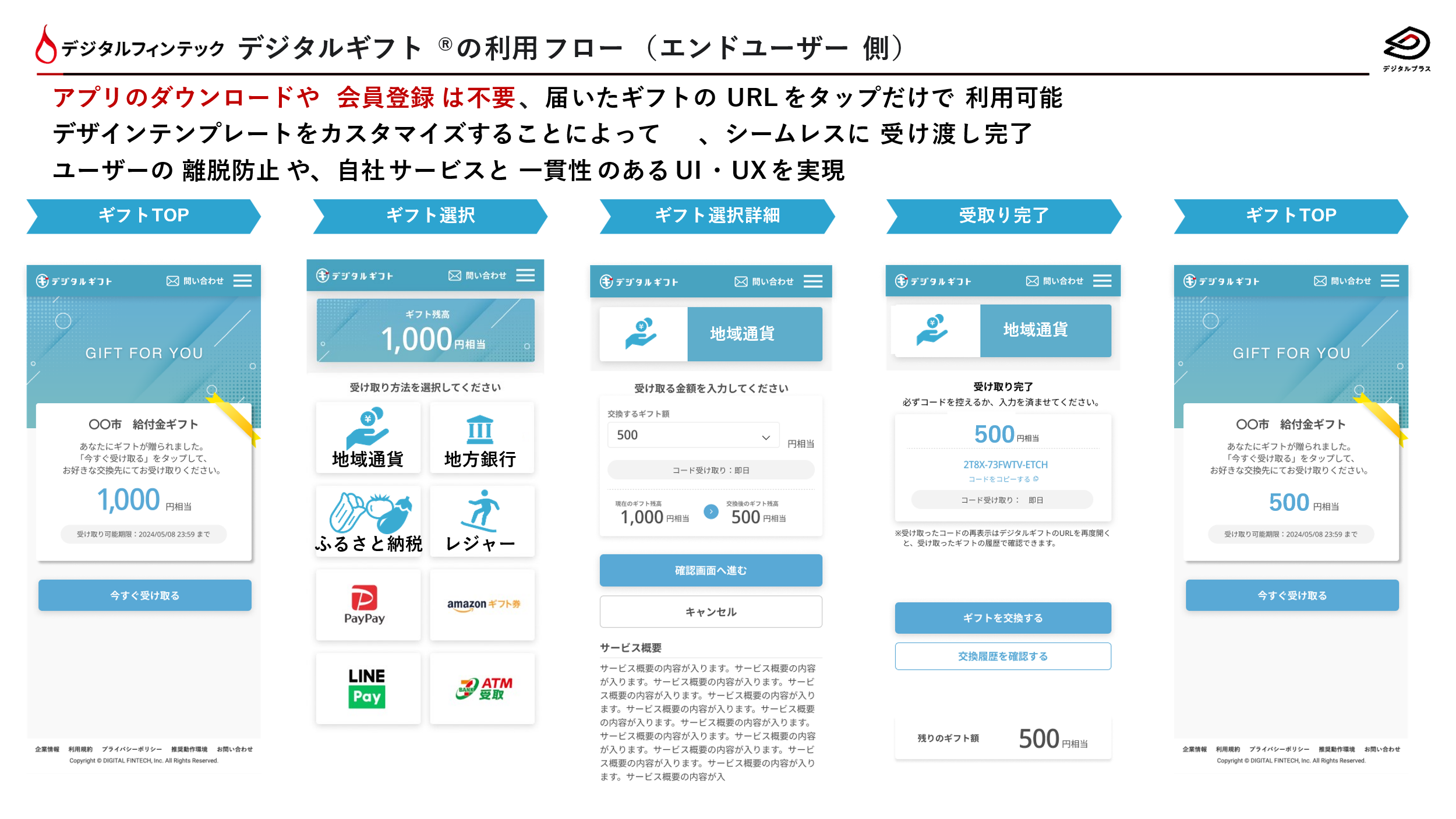 デジタルギフト®は会員登録不要で誰でも簡単に自分の欲しいギフトを自由に選択できるサービスです。行政機関との連携により、経済支援策や移住支援・インバウンドの助成金等を本サービスで配布する他、ギフトの受け手は、ふるさと納税や地域通貨または地方銀行等から好きな交換先を選択して受け取ることが可能です。