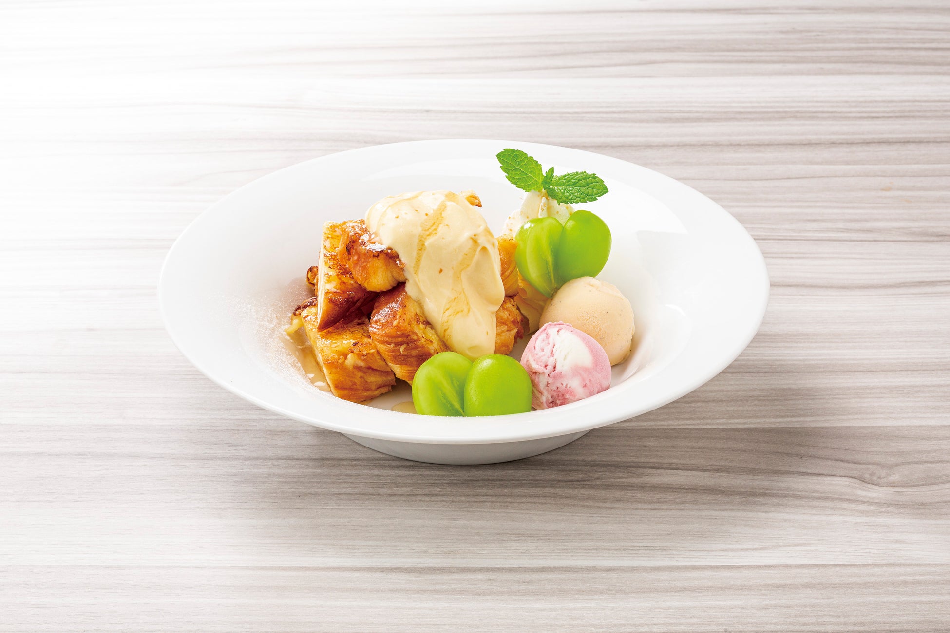 しっとりふんわりと焼き上げたフレンチトーストに、みずみずしいシャインマスカットを添えた季節感あふれるデザート。ひんやりとしたバニラアイス、ほどよい酸味が心地よいラズベリークリームチーズアイス、コクを感じながらも後味にキレのあるマスカルポーネクリームなど、多彩な素材をエレガントに盛り合わせました。