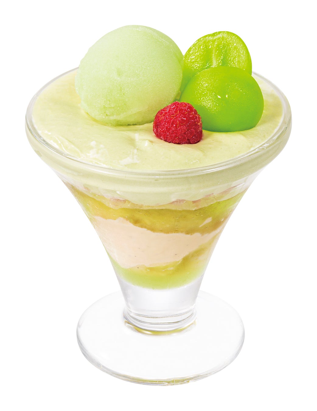 マスカットクリーム、マスカットソース、すっきりとした白ぶどうソルベなど、白ぶどうの魅力が凝縮!ラズベリークリームチーズアイスの甘酸っぱい風味とコクが、絶妙なアクセントになっています。白ぶどうの上品な香りと濃厚な甘さを堪能できる、サイズはミニでも大満足のデザートです。