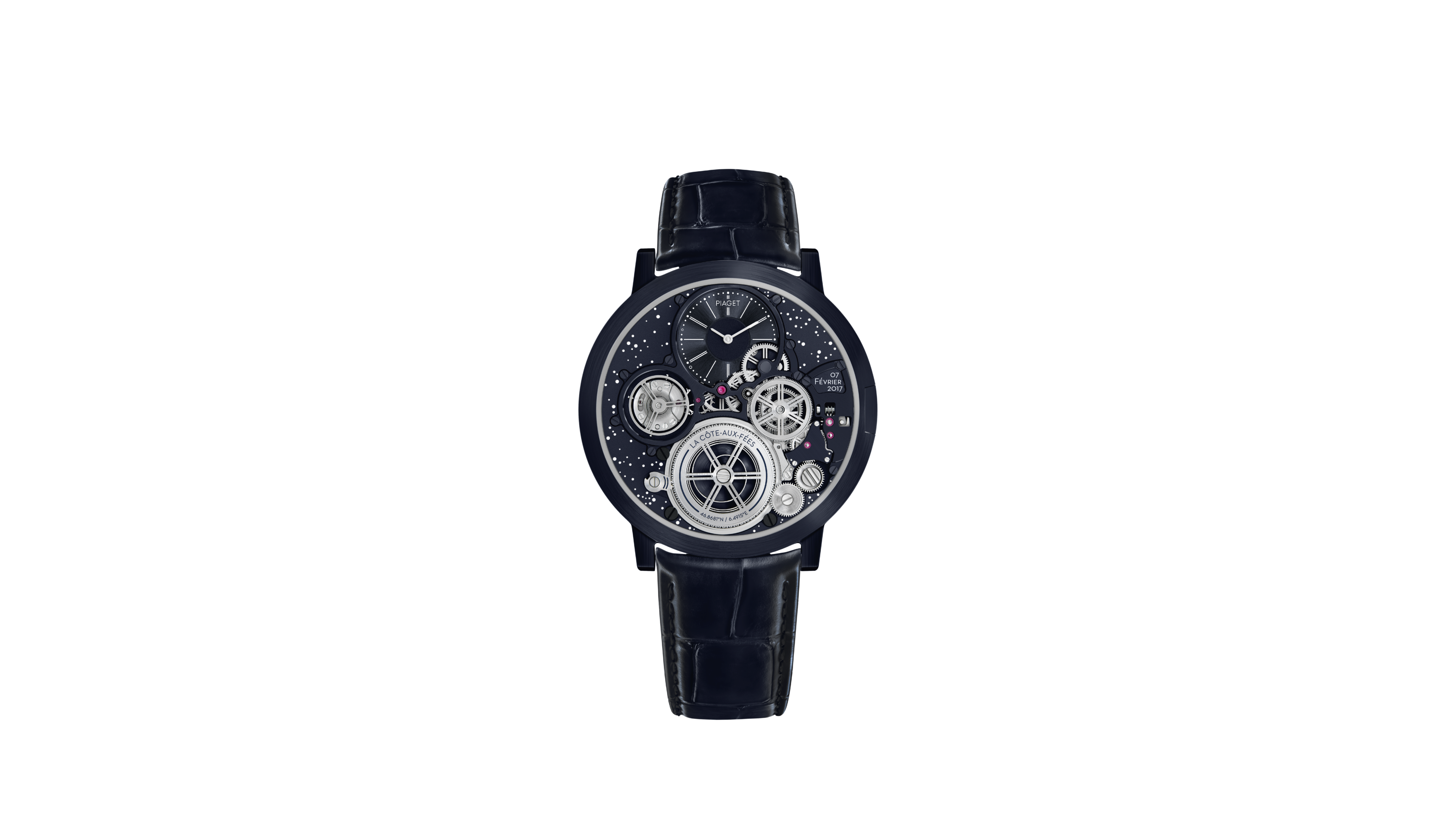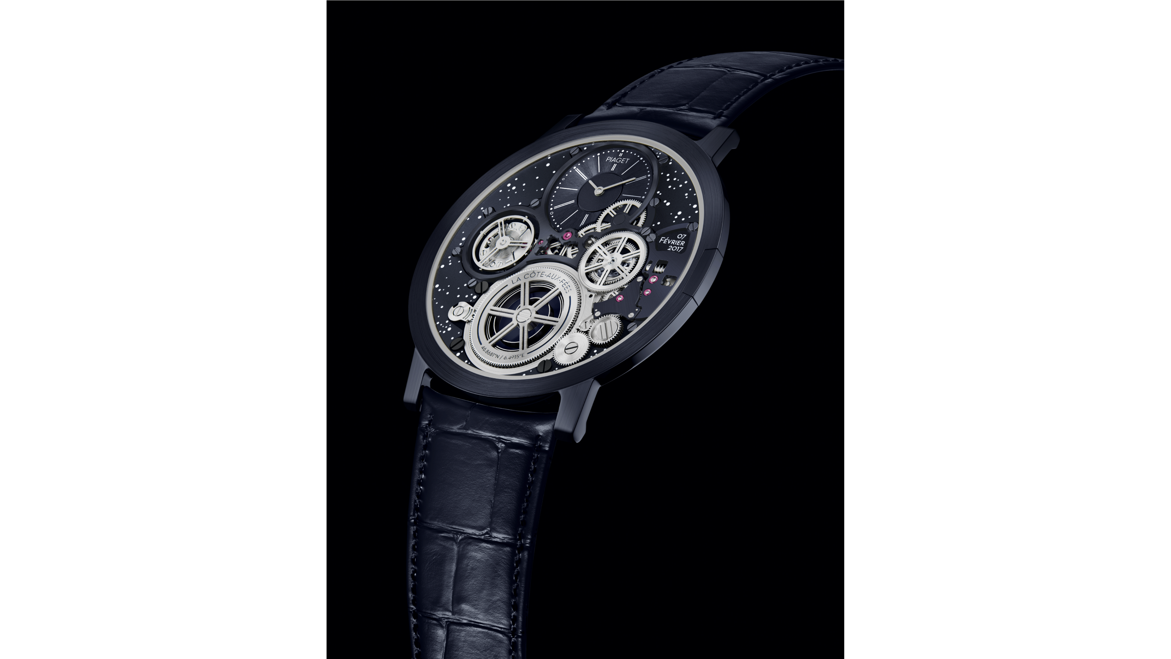 この新作のユニークピースのAUCには、ウォッチメイキングのこれまでの冒険物語を祝した、素晴らしい旅の記憶が随所に刻まれています。文字盤上部には歴史的なロゴが配置され、ドットインデックスには、AUCが最初に時を刻んだ時刻である7時47分が白枠で示されています。また、AUCが誕生した2017年2月7日の日付の刻印や、マニュファクチュールのGPS座標なども刻まれています。文字盤の背景にはスーパールミノバ加工による星が描かれ、AUC誕生当時のラ・コート・オ・フェの上空を再現しています。